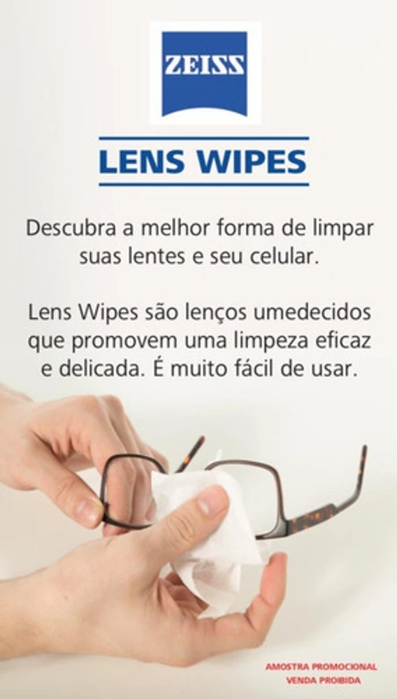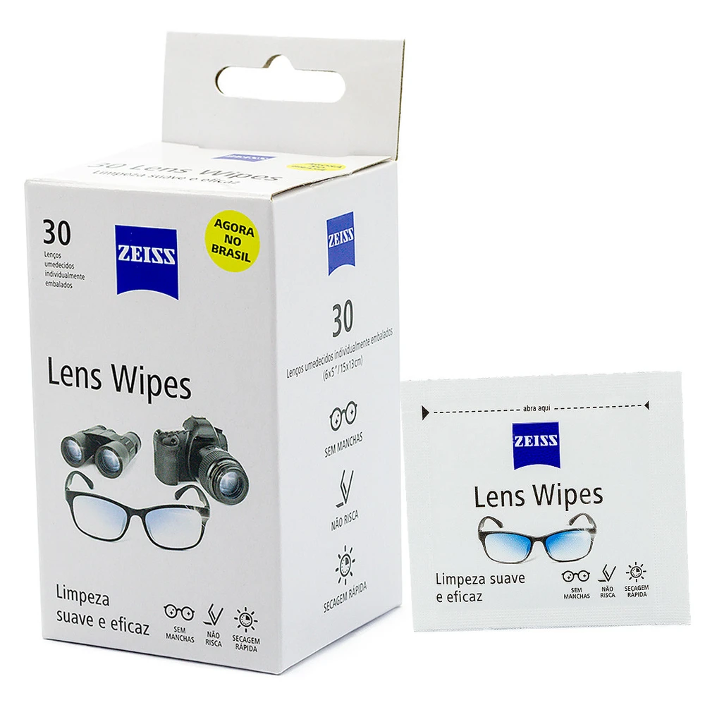 ZEISS LENS WIPES - LENÇOS PARA LIMPEZA DE LENTES A Solução ideal para limpeza de lentes Limpador de uso Geral, cada caixa contém 30 lenços umedecidos micro finos fabricado pela Zeiss, líder mundial na indústria óptica. Zeiss Lents Wipes é a solução profissional para a limpeza e manutenção de lentes e outras superfícies de equipamentos Indicação de uso: - Limpeza de lentes de óculos, particularmente lentes de alta qualidade com tratamento antirreflexo e fotossensíveis. - Superfícies de equipamentos (Monitores LCD, smartphones, tablets, cameras fotograficas, celulares e etc.) Rápido e fácil de usar: - Remova suavemente a poeira e a sujeira com o lenço dobrado - Desdobre o lenço e limpe a superfície com movimentos circulares - Use o lenço apenas enquanto estiver umedecido NÃO CONTÉM: substâncias de limpeza agressivas e fragrâncias artificiais. PRODUTO NOVO 100% ORIGINAL, SOMOS LOJA FÍSICA A