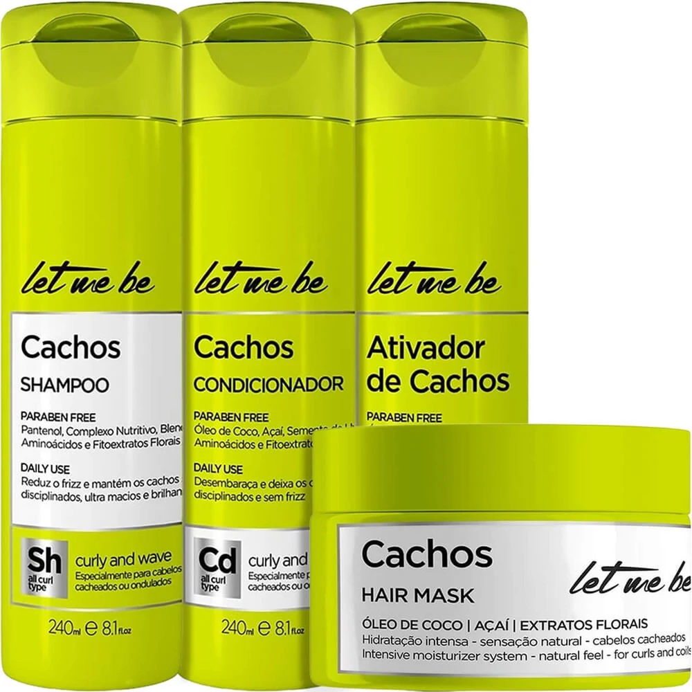 A linha Cachos Let Me Be foi desenvolvida para cabelos cacheados ou ondulados a fim de proporcionar os cachos mais saudáveis, maleáveis e soltos. Elaborada com Óleos de Coco, Açaí e Semente de Uva, Manteigas de Tucumã, Karité e Cupuaçu, Blend de Aminoácidos e Fito Extratos Florais, possui propriedades reparadores, umectantes e nutritivas, atribuindo leveza, movimento, brilho e maciez aos cachos.