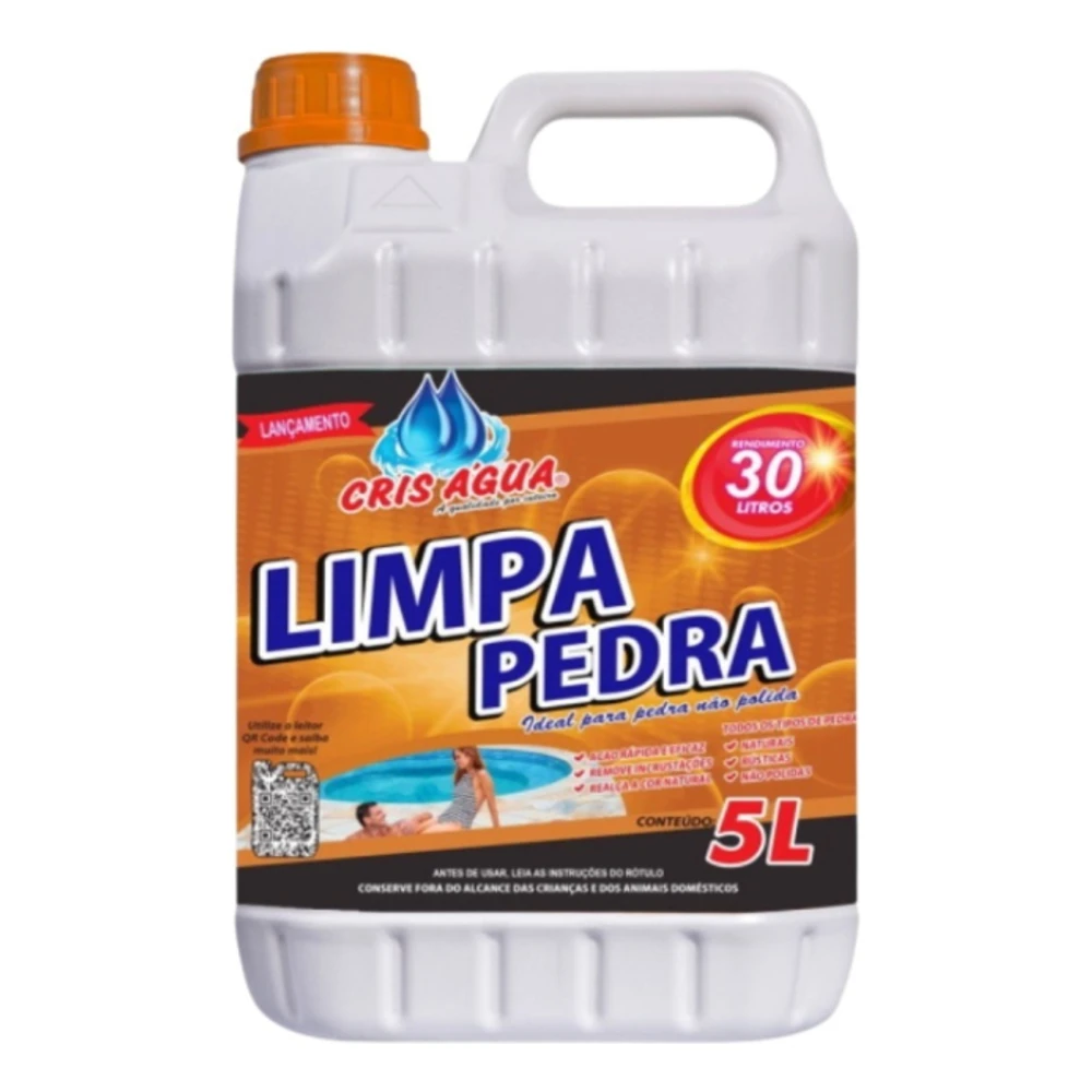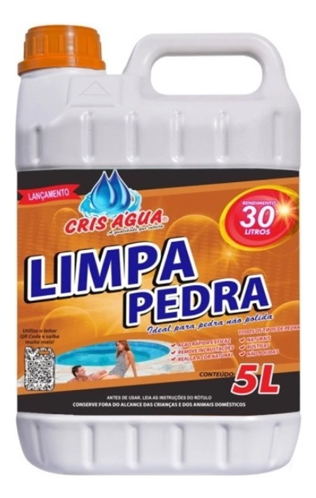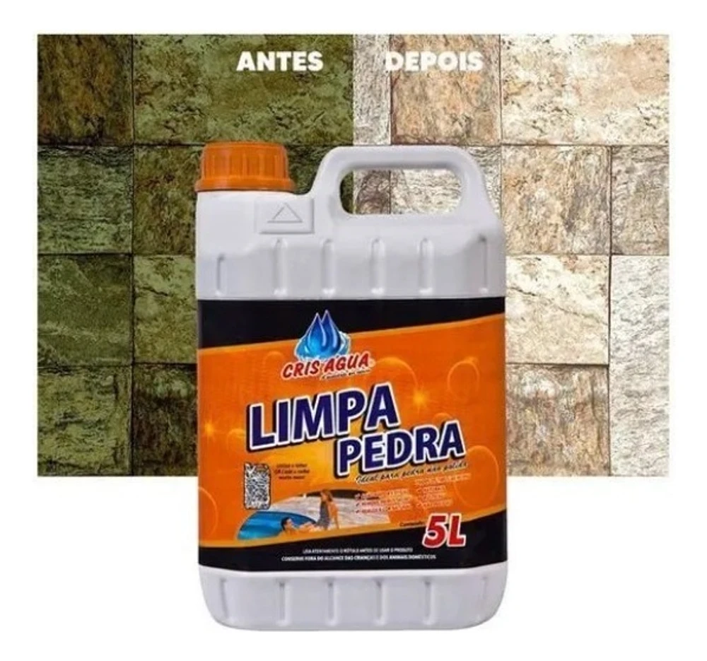 ATENÇÃO ATENÇÃO ATENÇÃO ATENÇÃO :Não usar : pisos ceramicos, porcelanatos, pisos frios.SOMENTE SER APLICADO EM PEDRAS NATURAIS.Limpa Pedra Cris Água - 5 LitrosO Limpa Pedra CRIS ÁGUA é um produto de ação rápida, que proporciona uma limpeza eficaz, sem alterar a cor natural da pedra, sua ação remove incrustações e oxidações superficiais que tiram o brilho da pedra.FINALIDADE: Produto exclusivo para limpeza de PEDRAS NÃO POLIDAS.OBSERVAÇÃO: Este produto é PROIBIDO USAR EM PISOS ESMALTADOS OU CERÂMICAS.Instruções de Aplicação:1 ? Aplicar o produto Limpa Pedra CRIS ÁGUA na pedra seca;2 ? Em seguida esfregar com vassoura de pelo;3 ? Deixar agir alguns minutos e antes que o produto seque, enxague.OBS: OBRIGATÓRIO O USO DE BOTAS E LUVAS DE BORRACHADOSAGEM:Limpa Pedra para ArdósiaDiluir 1 litro de Limpa Pedra CRIS ÁGUA para cada 20 litros de água.Para Demais PedrasDiluir 1 litro de Limpa Pedra CRIS ÁGUA para cada 5 litros de água.