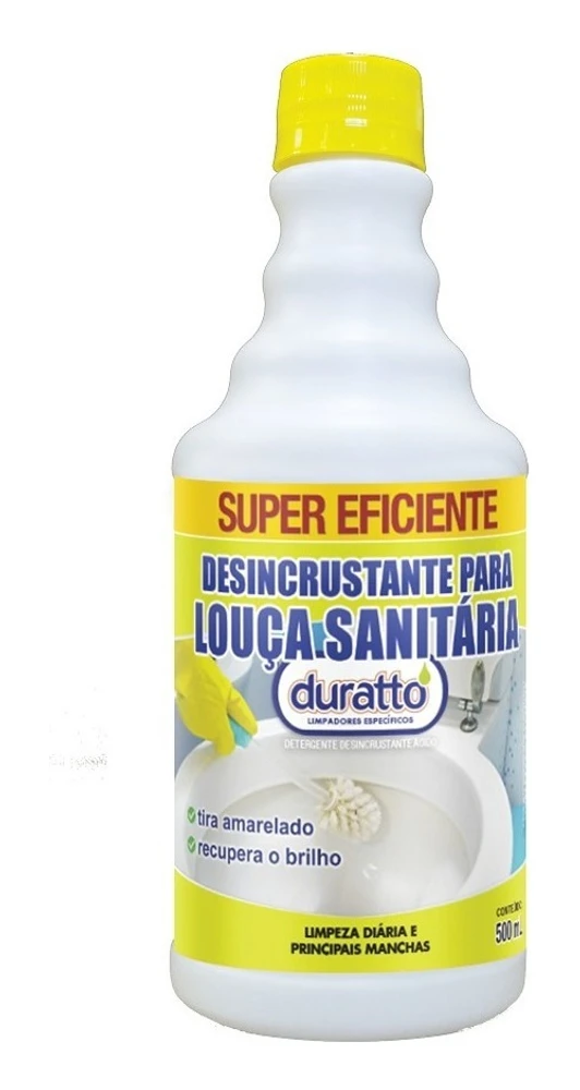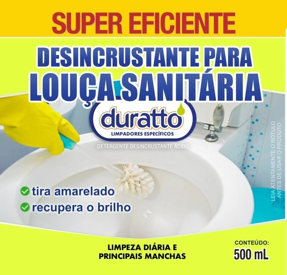 Desincrustante Para Louça Sanitária 500ml DurattoUsar em:todas as louças sanitárias, tais como: vaso sanitário, bidê, mictório e pias.Não usar em: granito, mármore, granilite e pisos de base cimentícia.Aplicações doDesincrustante Para Louça Sanitária 500ml Duratto- Tira incrustações de louças sanitárias;- Remove manchas amareladas;- Limpa limo e outras sujidades típicas;- Recupera o brilho (revestimento da cerâmica).- Embalagem: 500mlIndicações de uso doDesincrustante Para Louça Sanitária 500ml DurattoModo de usar / RendimentoA- DOSAGEM:A1- Remoção de manchas ou incrustações:Use de 100ml a 200ml do produtoA2- Limpeza diária:Use 50ml do produto. Previne a formação de manchas e a incrustação de sujidades.B- APLICAÇÃO (LIMPEZA):B1- Vasos sanitários:1-Coloque a dosagem sugerida diretamente na água do vaso;2-Umedeça uma esponja tipo dupla face ou uma escova sanitária nesta solução e espalhe na superfície pretendida (use luvas de látex para tanto);3-Dê a descarga ou enxágue a superfície com água para remover o produto e as sujidades.B2- Outras louças:1-Dilua a dosagem sugerida em um recipiente com 1 litro de água;2-Umedeça uma esponja tipo dupla face ou uma escova sanitária nesta solução e espalhe na superfície pretendida (use luvas de látex para tanto);3-Dê a descarga ou enxágue a superfície com água para remover o produto e as sujidades.
