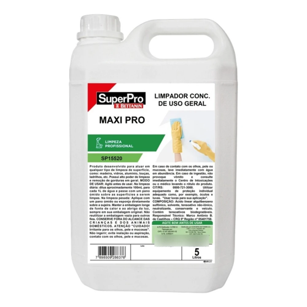 BETTANIN SUPERPRO LIMPADOR MAXI PRO CONCENTRADO 5LTSUm produto com a garantia Bettanin Super Pro, o melhor em limpeza profissional !!!!Composição: Tensoativos Aniônicos, Alcalinizante, Antiespumante, Conservante, Fragrância E Veículo.Especificações Técnicas : Aplicar A Solução Diluída Conforme A Sujidade Com Auxilio De Um Pulverizador, Esponja, Fibra Ou Pano. Esfregar A Área Retirar A Sujidade Com Pano Umedecido. Se A Superfície Estiver Encardida Deixar Agir Por 5 Minutos E Enxaguar Com Água.Aplicação:Produto Desenvolvido Para Atuar Em Qualquer Tipo De Limpeza De Superfície, Como: Madeira, Vidros, Alumínio, Louças, Ladrilhos, Etc. Possui Alto Poder De Limpeza E Remoção De Gorduras Em Geral.Produto concentrado ; diluição 100 ml de produto para cada 01 litro de agua.otimo rendimento, 05 lts pode render até 500 litros de produto final. Muita economia .