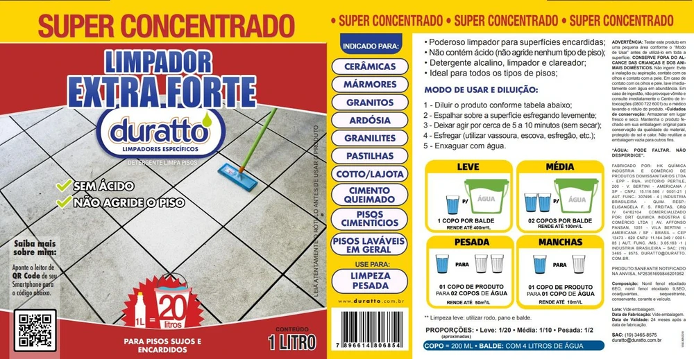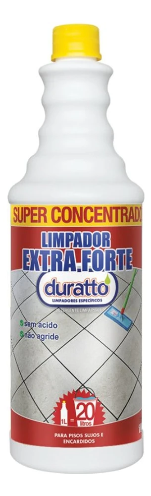 Descrição / Embalagens:* Poderoso limpador para superfícies encardidas;* Não contém ácido (não agride nenhum tipo de piso);* Detergente alcalino, limpador e clareador;* Ideal para todos os tipos de pisos.Embalagem: 1L1 litro do produto rende até 20 litrosProduto super concentradoIndicações de uso:Usar em: todos os tipos de pisos, tais como: cerâmicas, mármores, granitos, ardósia, granilites, pastilhas, cimento queimado, cotto/lajotas e pisos cimentícios.Modo de usar / Rendimento:1- Diluir produto conforme a tabela abaixo;2- Espalhar sobre a superfície esfregando levemente;3- Deixar agir por cerca de 5 a 10 minutos (sem secar);4- Esfregar (utilizar vassoura, escova, esfregão, etc.);5- Enxaguar com água.