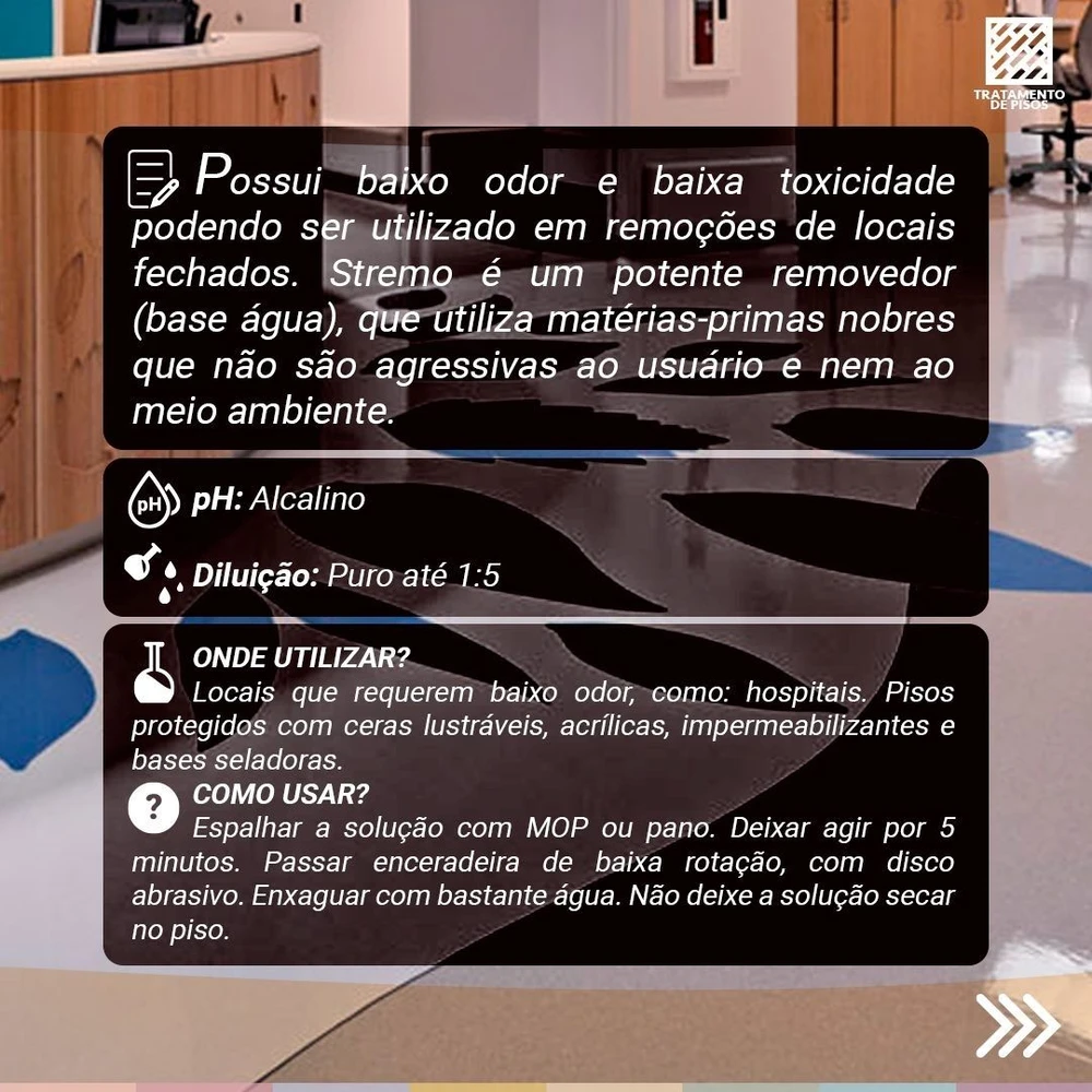 Possui baixo odor e baixa toxicidade podendo ser utilizado em remoções de locais fechados. Stremo é um potente removedor (base água), que utiliza matérias-primas nobres que não são agressivas ao usuário e nem ao meio ambiente.