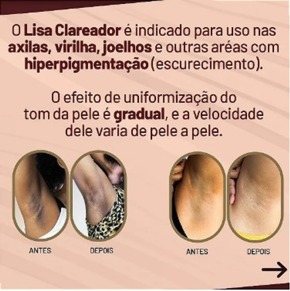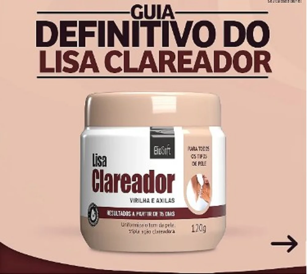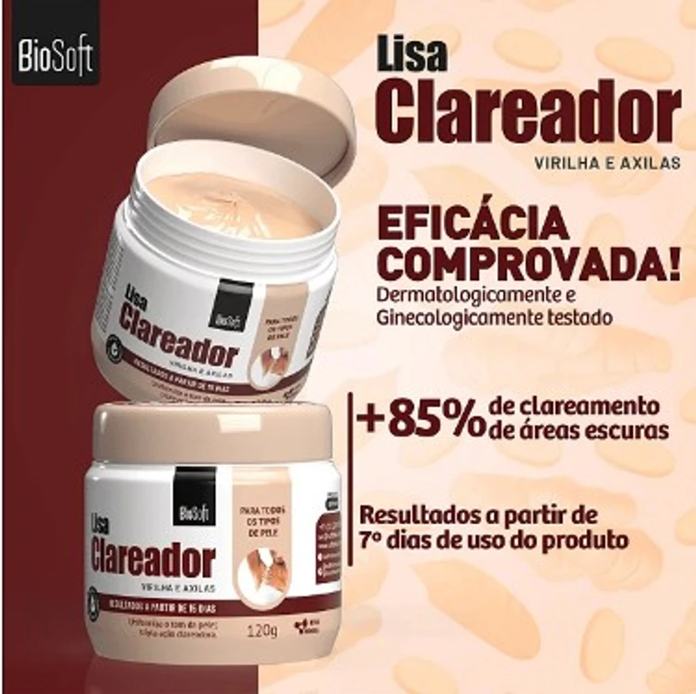 Descubra o poder do LISA CLAREADOR BIO SOFT 120G, especialmente formulado para clarear virilha e axilas com eficácia comprovada. Ideal para todos os tipos de pele, proporciona uniformização do tom, reduzindo áreas escuras em até 85%, com resultados visíveis a partir do 7º dia de uso, garantindo segurança dermatológica e ginecológica. Sua fórmula de tripla ação clareadora atua profundamente, promovendo suavidade e renovação da pele, eliminando o aspecto manchado e devolvendo a confiança no cuidado íntimo.