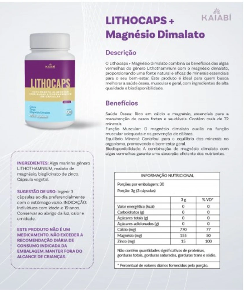 Kaiabí Lithocaps é um suplemento nutricional que combina os benefícios do Lithothamnium, um tipo de alga rica em minerais essenciais. Cada cápsula contém 770 mg de cálcio, 155 mg de magnésio e 15 mg de zinco, nutrientes fundamentais para a saúde óssea e o funcionamento adequado do organismo. Este produto é ideal para adultos a partir de 19 anos que buscam fortalecer sua dieta com ingredientes de origem natural.