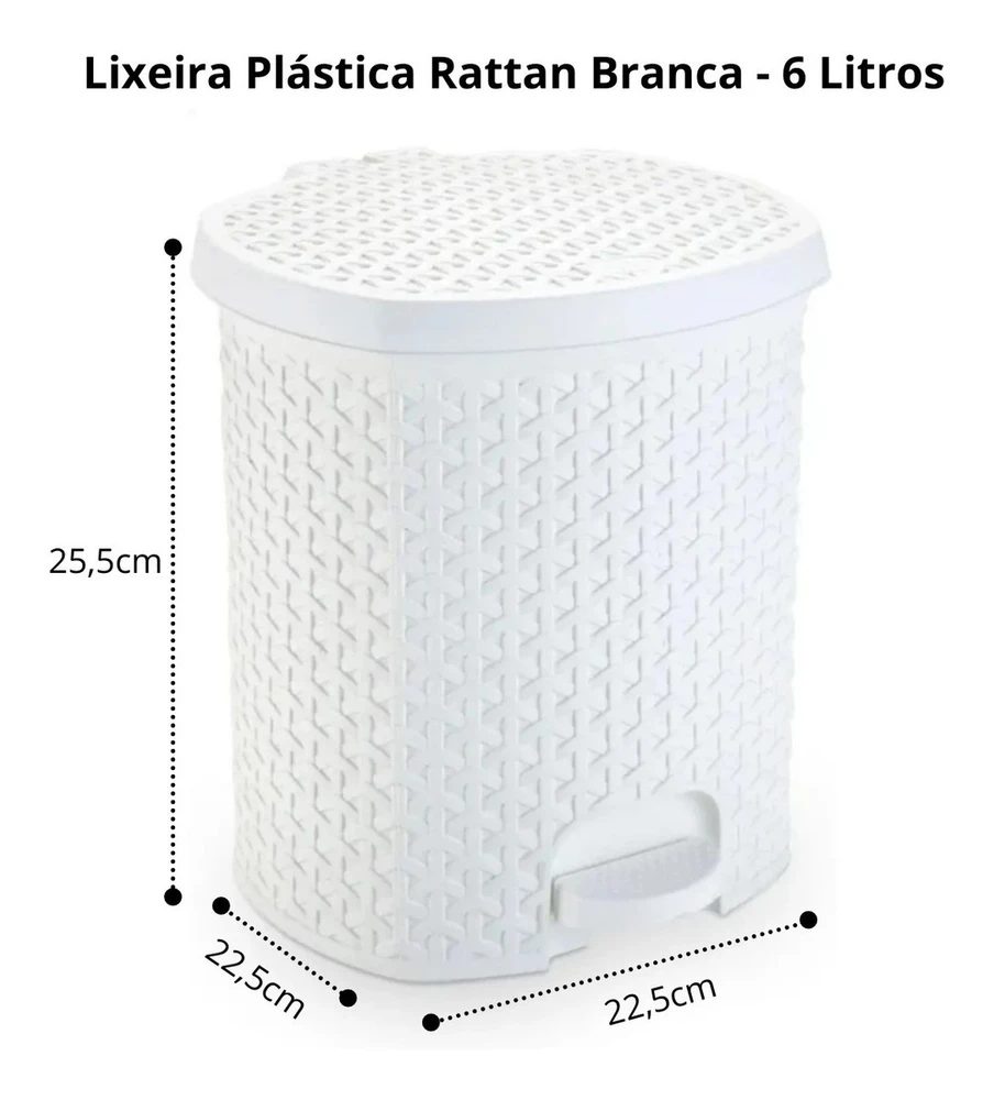 A Lixeira Rattan Com Pedal de 6 Litros é uma peça essencial para manter o ambiente organizado e limpo. Com um design delicado e charmoso, é versátil para uso em diversos espaços como cozinha, banheiro, quarto, escritório, ateliê, salão de beleza, consultório, clínica e loja.O modelo apresenta um estilo bonito, moderno e sofisticado, harmonizando com a decoração do local. Prática e higiênica, possui pedal que facilita a abertura sem necessidade de contato manual.Confeccionada em plástico, tem acabamento externo em rattan e interior liso, o que facilita sua limpeza e higienização.