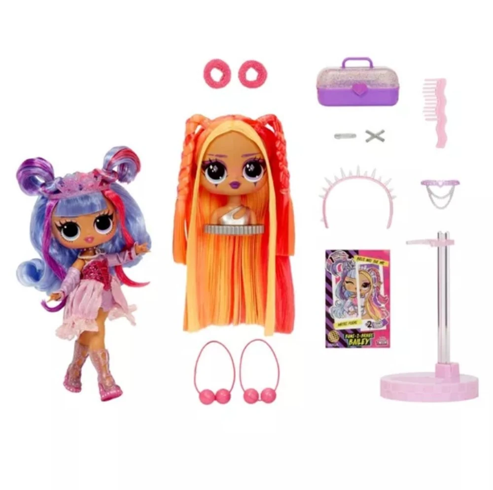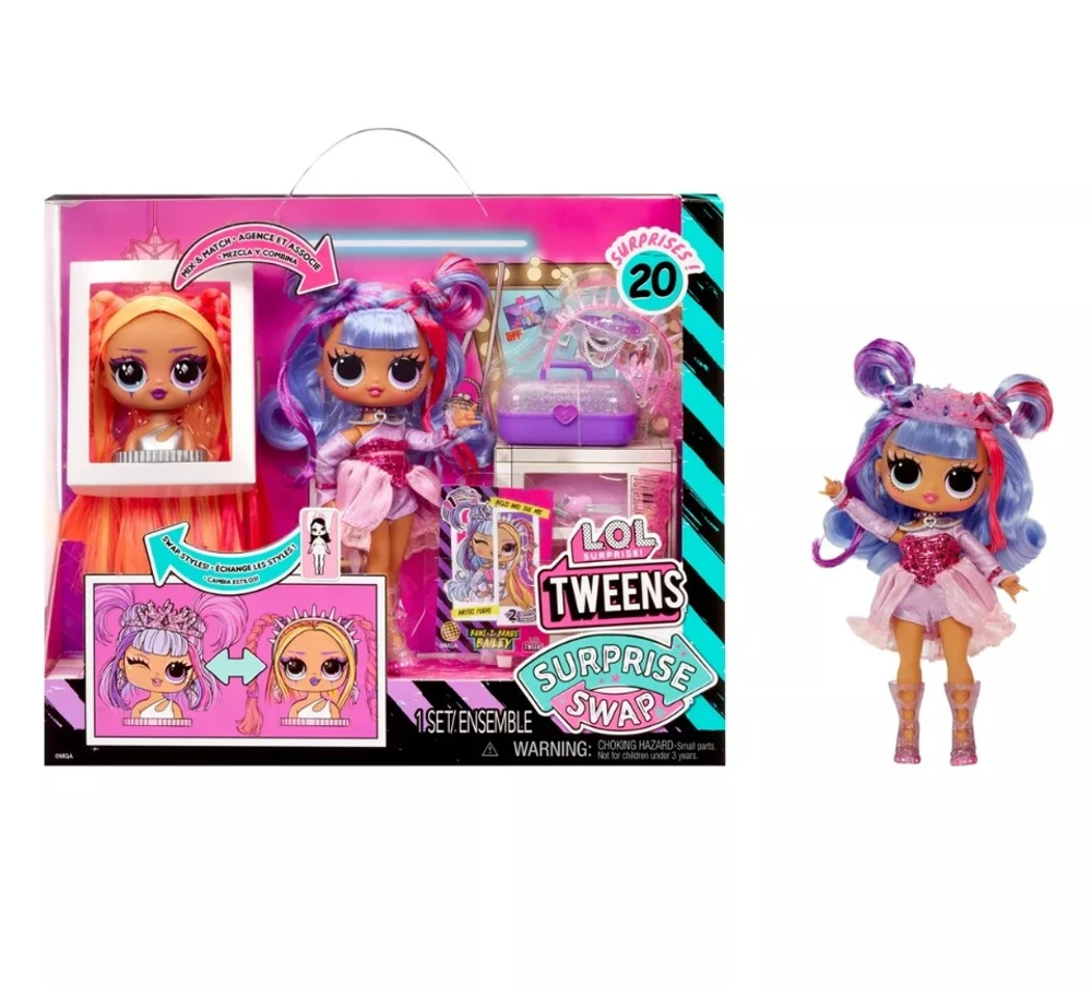 Apresentando a novíssima LOL Surprise Tweens Surprise Swap? Fashion Doll Buns-2-Braids Bailey, que vem com 2 visuais exclusivos e uma cabeça de estilo trocável para a melhor experiência de personalização e brincadeira de cabelo! Bailey é mais reconhecida como uma artista sensacional, surpreendendo multidões com seus vocais poderosos ao cantar no microfone, mas fora do palco, ela adora relaxar e explorar mais seus talentos artísticos escrevendo poemas. Desembrulhe mais de 20 surpresas, incluindo uma cabeça de estilo, modas fabulosas, sapatos, um caboodle, um cinto, um colar, acessórios de estilo de cabelo, uma escova de cabelo, um suporte de boneca e muito mais! Mude o visual de Bailey em um instante trocando seu penteado azul, roxo e rosa pela cabeça de estilo neon magenta e laranja que pode ser facilmente presa ao corpo da boneca. Em seguida, troque de roupa rapidamente e troque os acessórios, incluindo o enfeite de cabeça, acessórios de cabelo e muito mais! Depois de terminar de estilizar sua boneca, repita o recurso de troca de cabeça e as trocas de acessórios várias vezes para criar looks infinitos de mixagem e combinação! Combine as bonecas Tweens Surprise Swap com as atraentes novas Surprise Swap? Styling Heads, cada uma com lindos cabelos e acessórios de cabelo para ainda mais personalização! Cada boneca tem características impressionantes, cabelos lindos, seu próprio estilo glamoroso e vem articulada para inúmeras oportunidades de poses. Os acessórios podem ser armazenados ordenadamente no adorável caboodle e a cabeça de estilo adicional pode sempre ser colocada de volta no suporte de cabeça quando não estiver em uso para facilitar a limpeza. Colecione todas as 4 bonecas da moda LOL Surprise Tweens Surprise Swap?: Braids-2-Waves Winnie, Bronze-2-Blonde Billie, Buns-2-Braids Bailey e Curls-2-Crimps Cora.