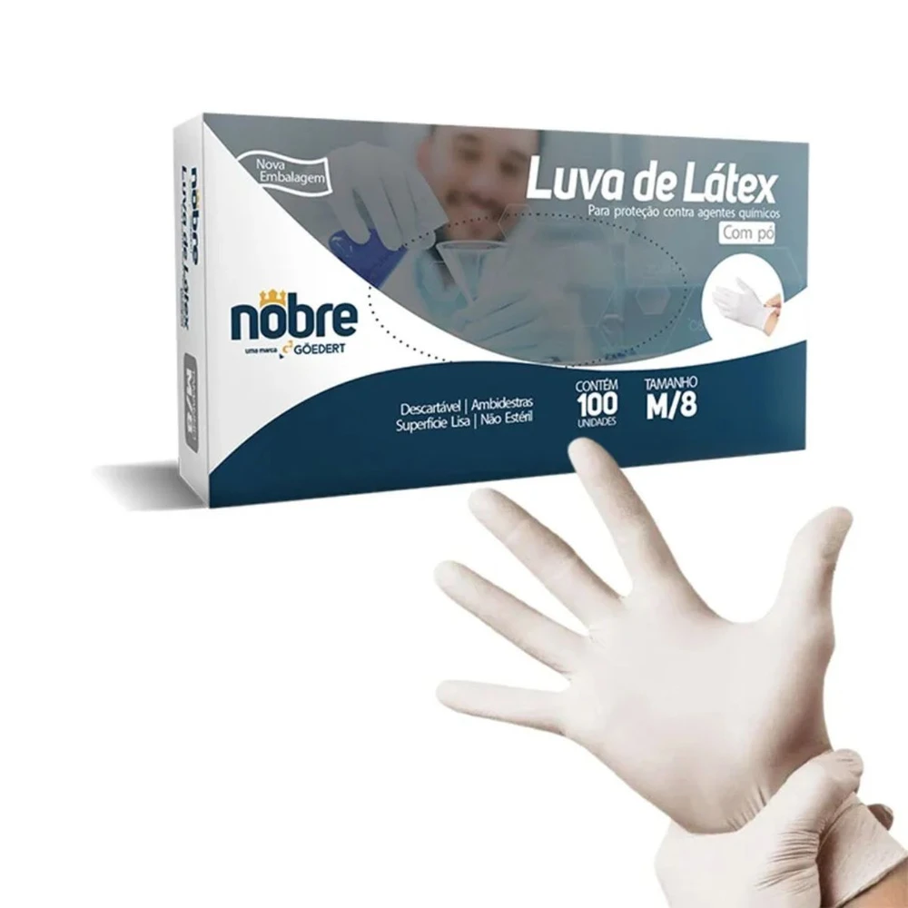 Luva de Látex com Pó Nobre – proteção eficiente contra agentes químicos, ideal para profissionais da saúde e setores que exigem alta segurança e higiene. Com 100 unidades no tamanho M/8, oferece conforto e resistência para uso prolongado, garantindo total segurança nas mãos. Seu design ambidestro e superfície lisa facilita o manuseio e a colocação rápida, com pó interno que aumenta a praticidade sem comprometer a proteção. Produto descartável e não estéril, indicado para atividades que demandam prevenção contra contaminação química, garantindo segurança sem abrir mão da sensibilidade tátil.