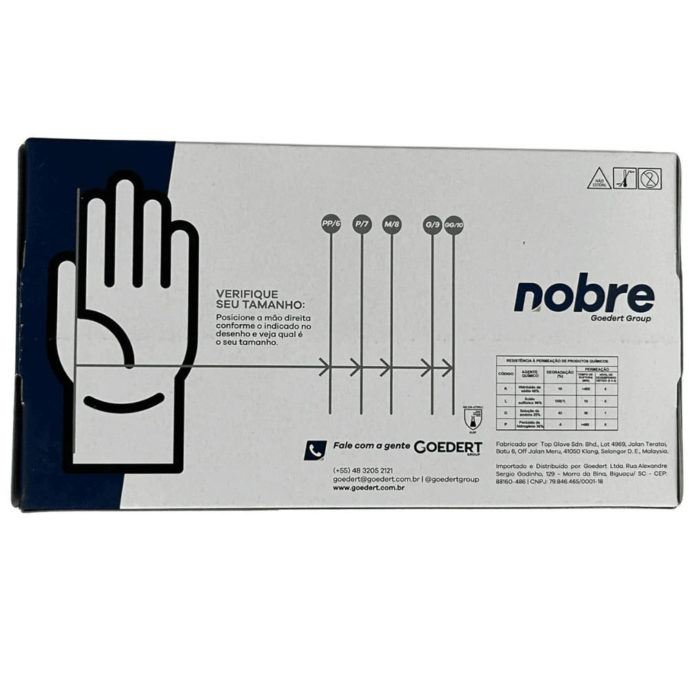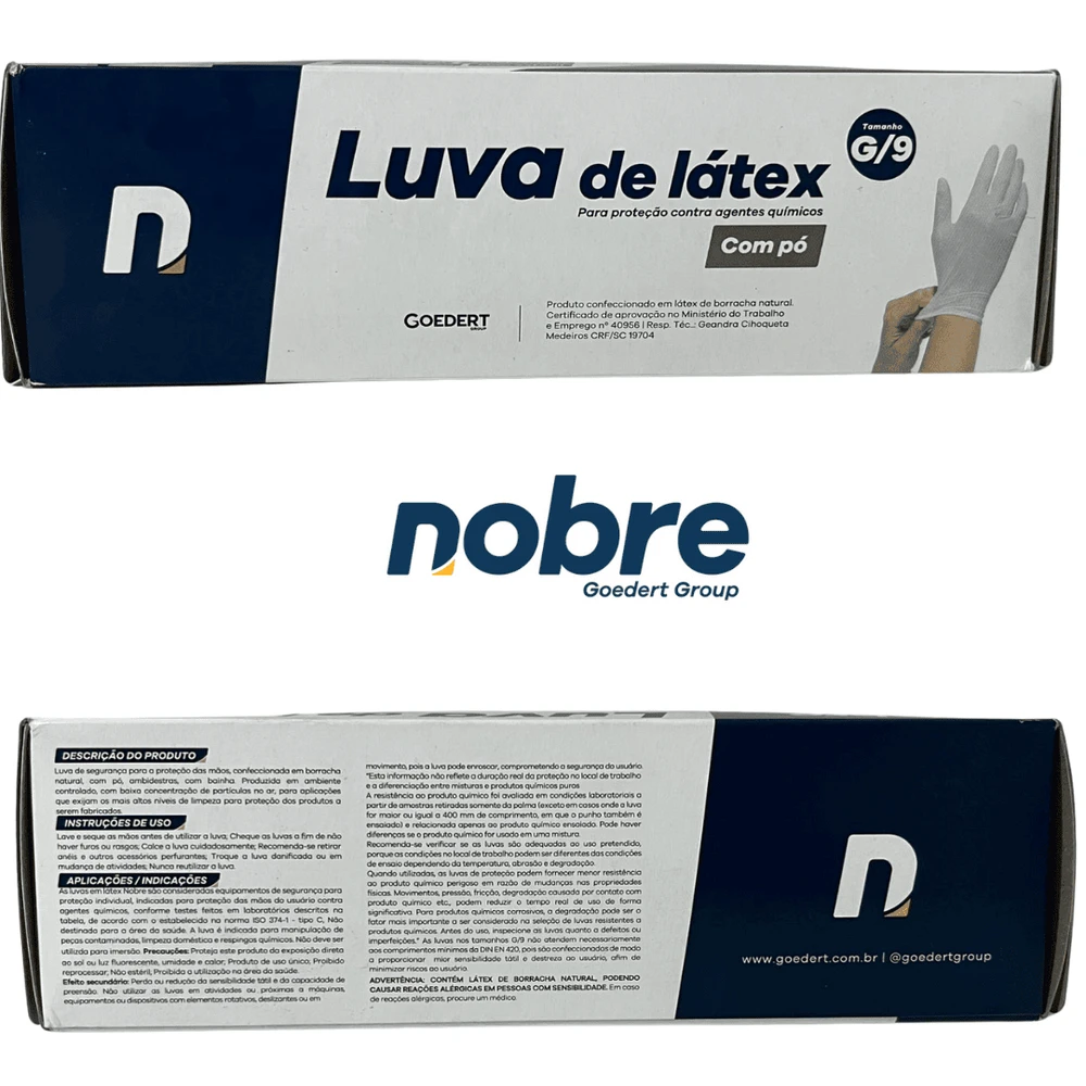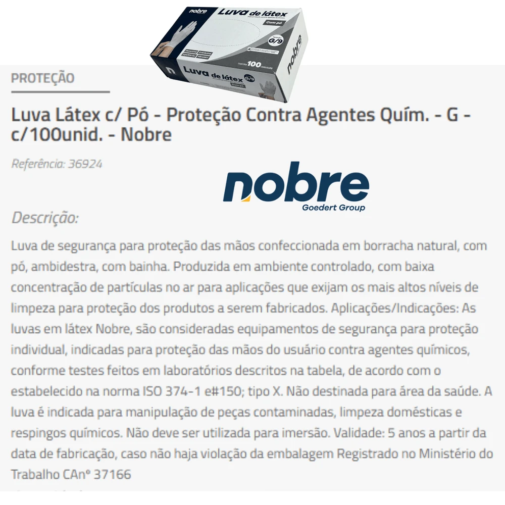 As luvas em látex Nobre são consideradas equipamentos de segurança para proteção individual, indicadas para proteção das mãos do usuário contra agentes químicos.