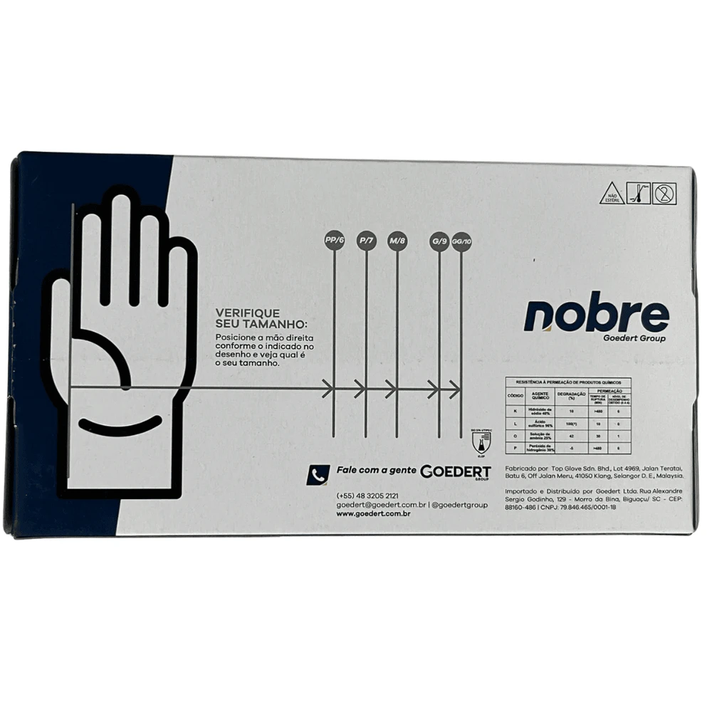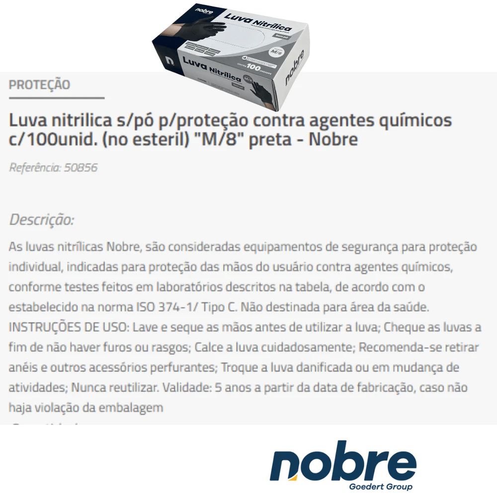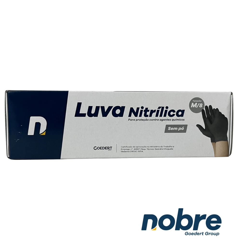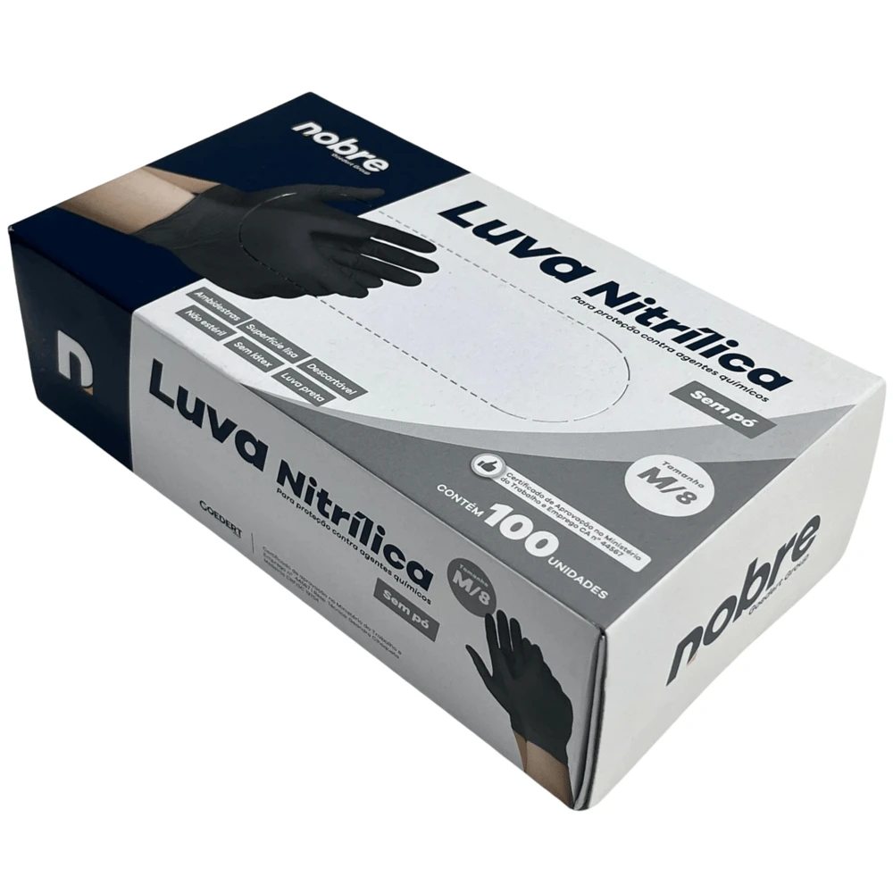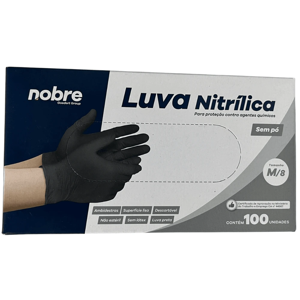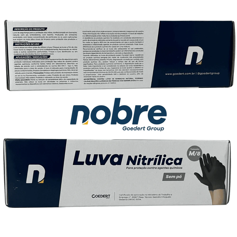 A Luva Nitrílica Preta Nobre, em embalagem com 100 unidades, é um equipamento de proteção individual (EPI) projetado para garantir segurança e higiene em diversas atividades. Fabricada em nitrilo, um material sintético de alta qualidade, essa luva é livre de látex e pó bioabsorvível, sendo ideal para pessoas com alergia a esses componentes. Sua composição proporciona alta resistência a perfurações, rasgos e agentes químicos, conforme a norma ISO 374-1/Tipo C, oferecendo proteção eficaz contra substâncias químicas em ambientes industriais, laboratoriais, estéticos e de limpeza.