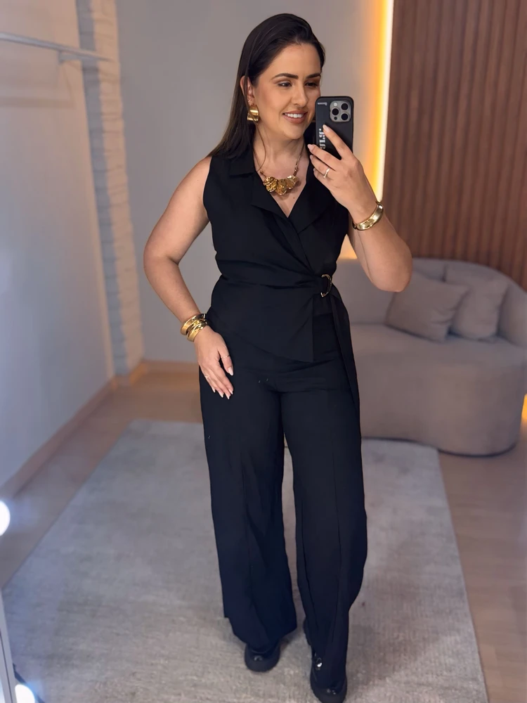 A calça possui modelagem levemente flare ou pantalona (dependendo da peça real), que alonga a perna e traz movimento fluido ao look – ideal tanto para o dia quanto para ocasiões noturnas.