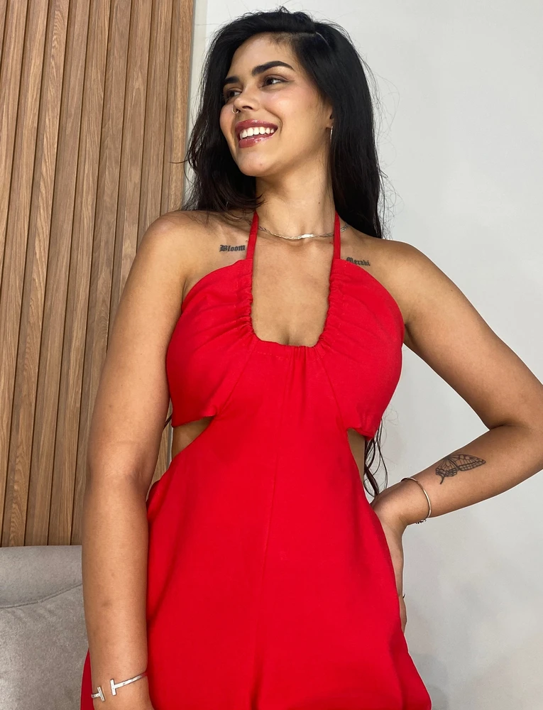 O grande destaque da peça é o recorte frontal com detalhe franzido, que valoriza o busto e adiciona um toque sensual na medida certa. As alças finas duplas trazem delicadeza ao visual, enquanto a amarração nas costas permite melhor ajuste ao corpo, além de deixar as costas parcialmente à mostra, garantindo um ar mais ousado e feminino.