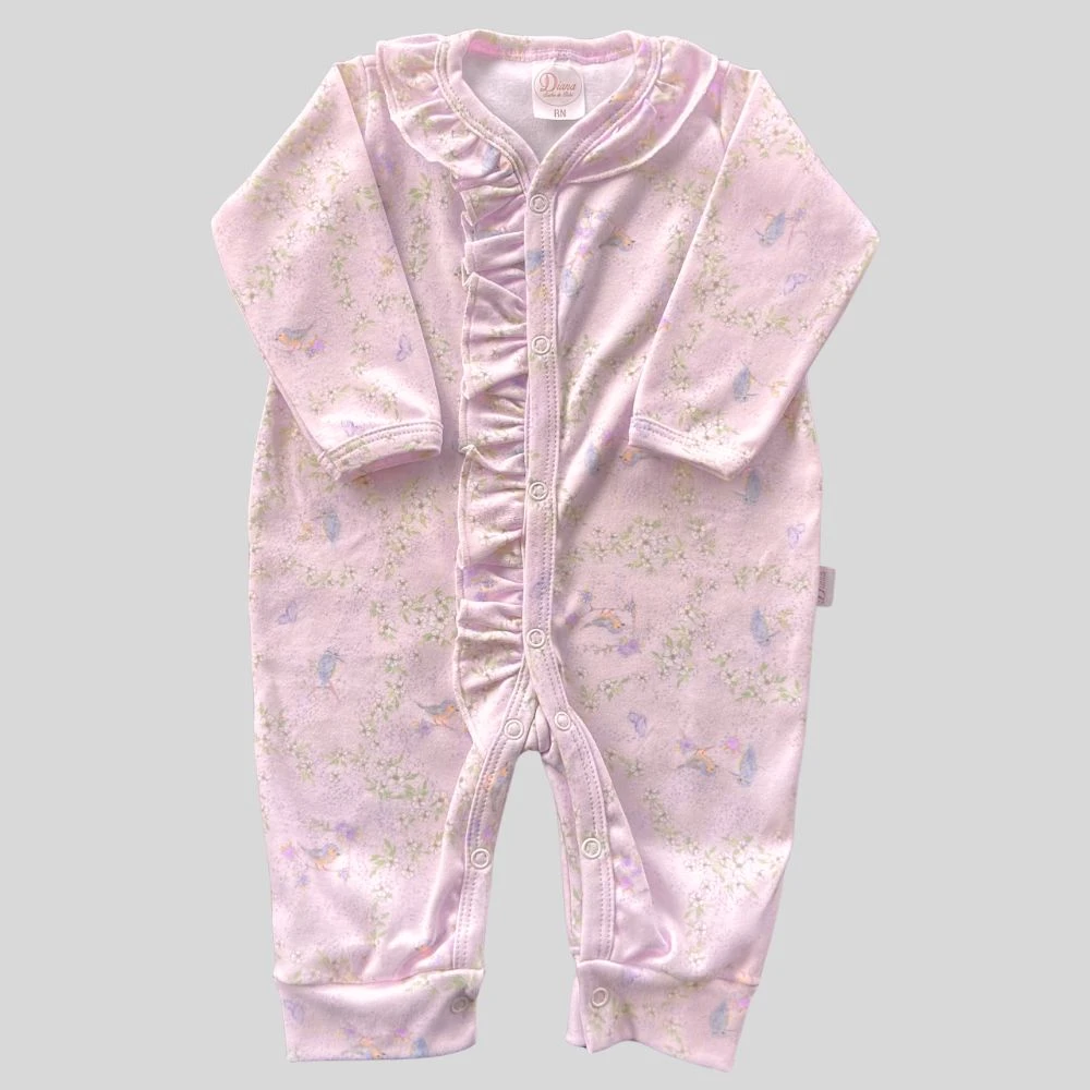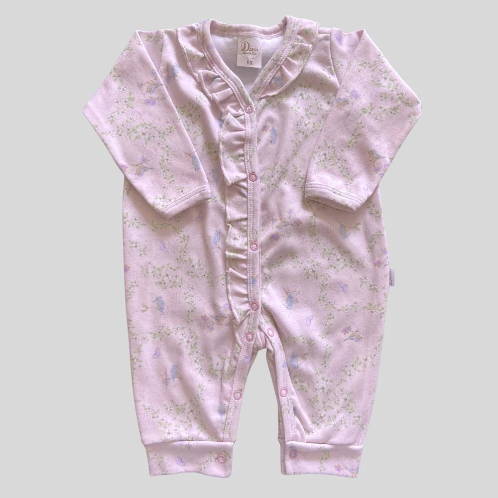 Macacão para bebê manga longa em suedine com babados estampa meu jardim Rosa Bebê