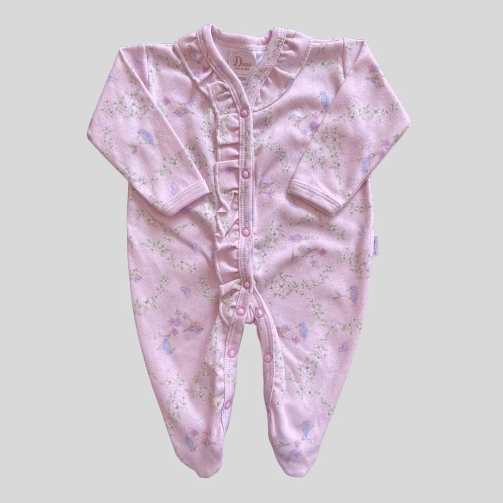 Macacão para bebê prematuro em suedine algodão egípcio com babados estampa jardim Rosa Bebê