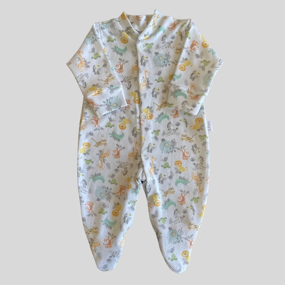 Macacão para bebê prematuro suedine algodão egípcio estampa safari Branco