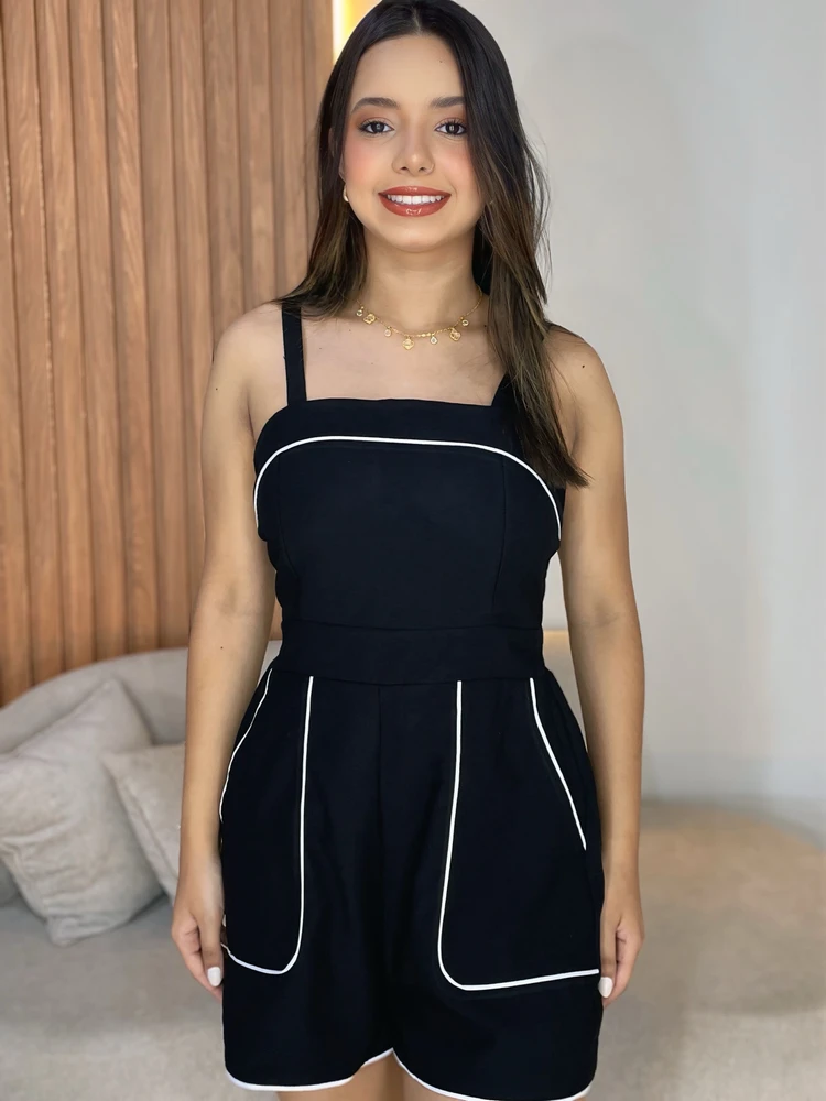 O tecido de alfaiataria confere ao macaquinho um ar sofisticado e ao mesmo tempo leve, ideal para os dias mais quentes. Além disso, o detalhe em branco na gola e nos bolsos traz um toque de modernidade e estilo ao look.