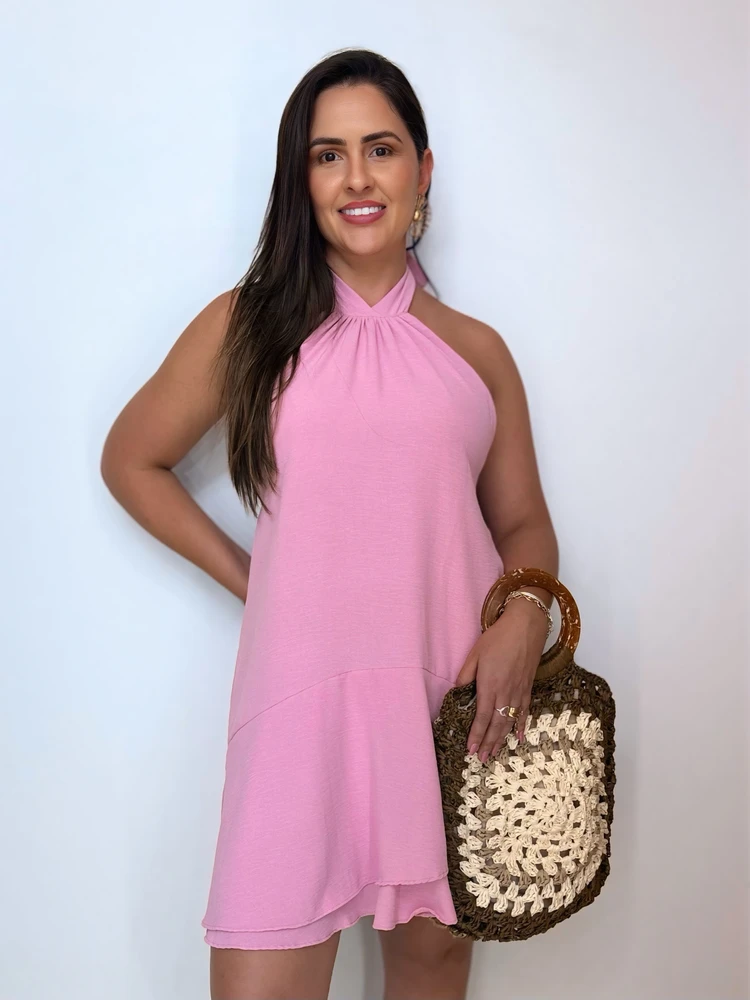 O modelo conta com decote em V que valoriza o colo, alças longas para amarração que permitem diferentes formas de uso e ajuste personalizado ao corpo. As costas abertas trazem charme extra à peça, deixando o look moderno e atual. A modelagem soltinha garante liberdade de movimento, enquanto o short integrado oferece praticidade e segurança.