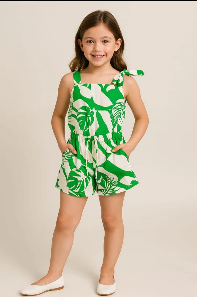 Macaquito estampa verde e branca com laço e frizze na cintura