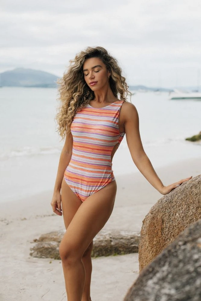 Maiô body clássico, possui bojo embutido, decote profundo nas costas e recorte nas laterais, calcinha fio duplo.