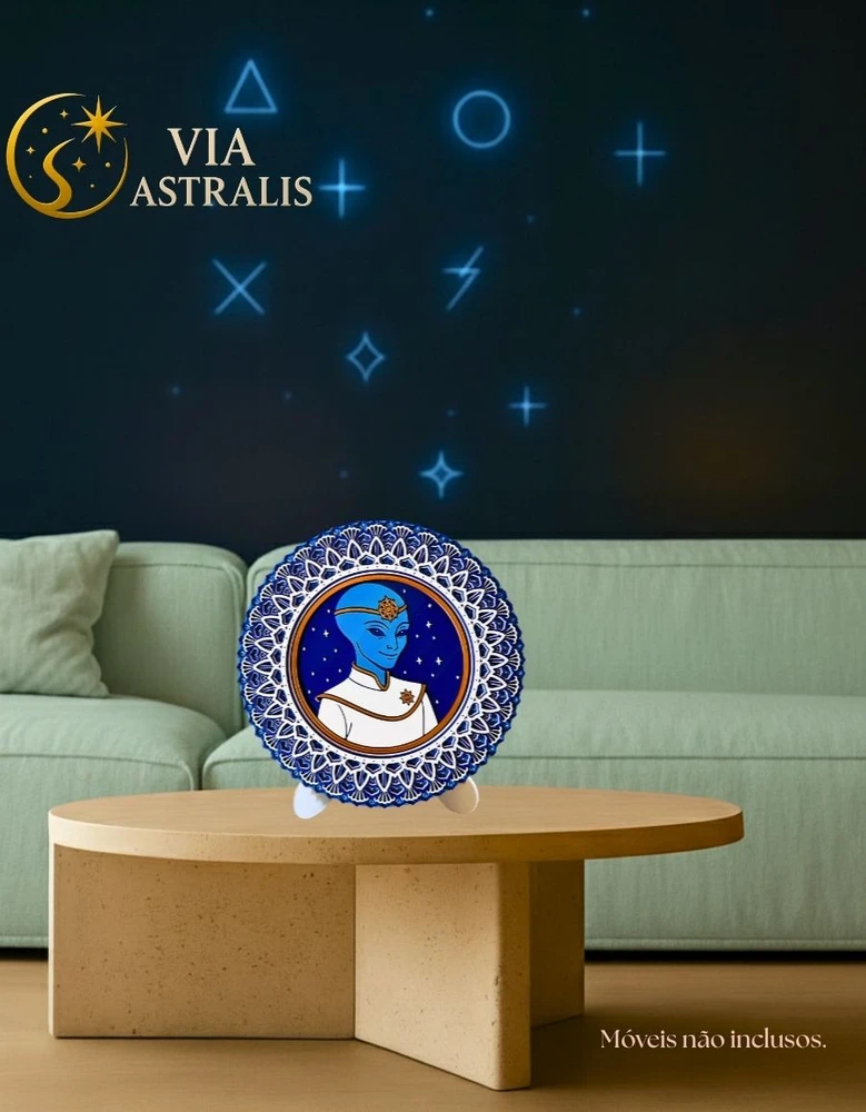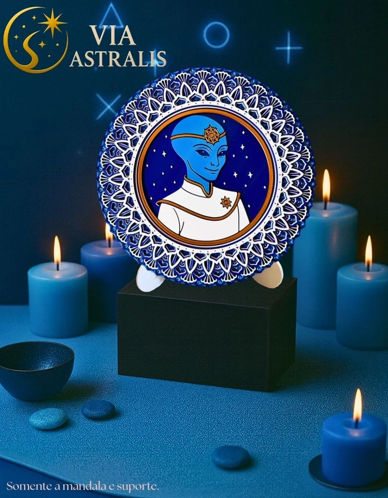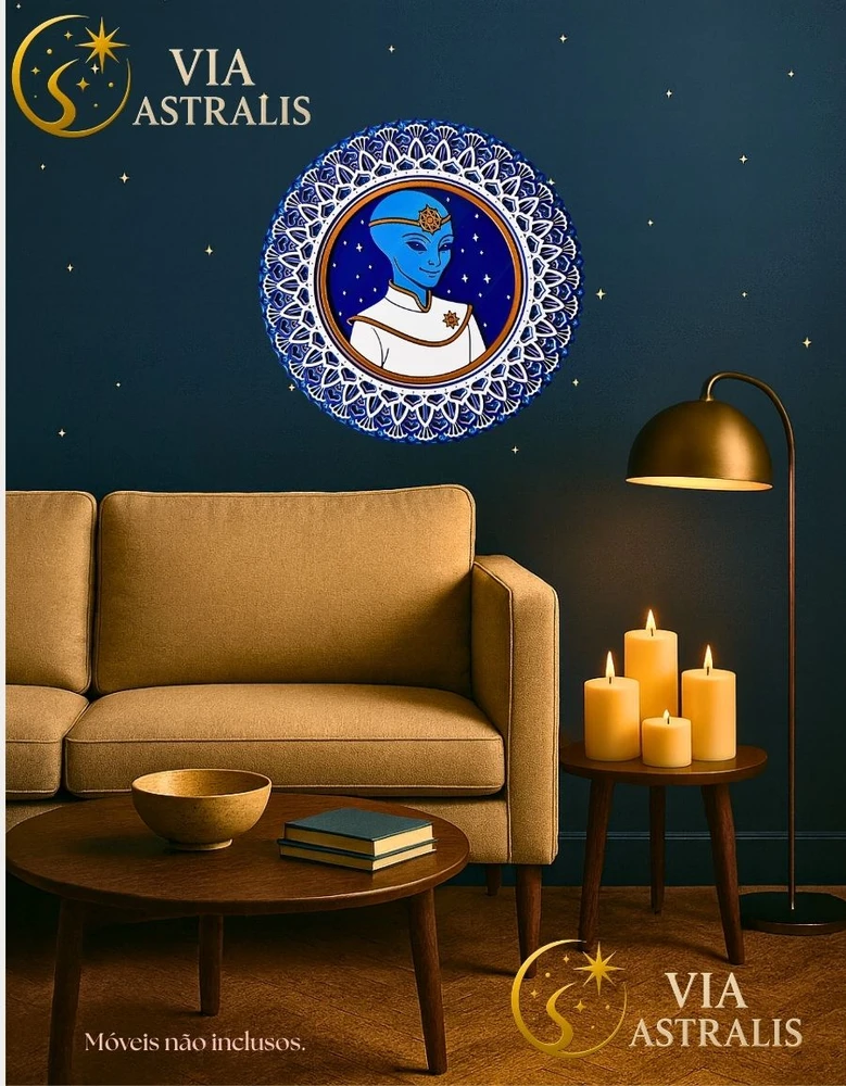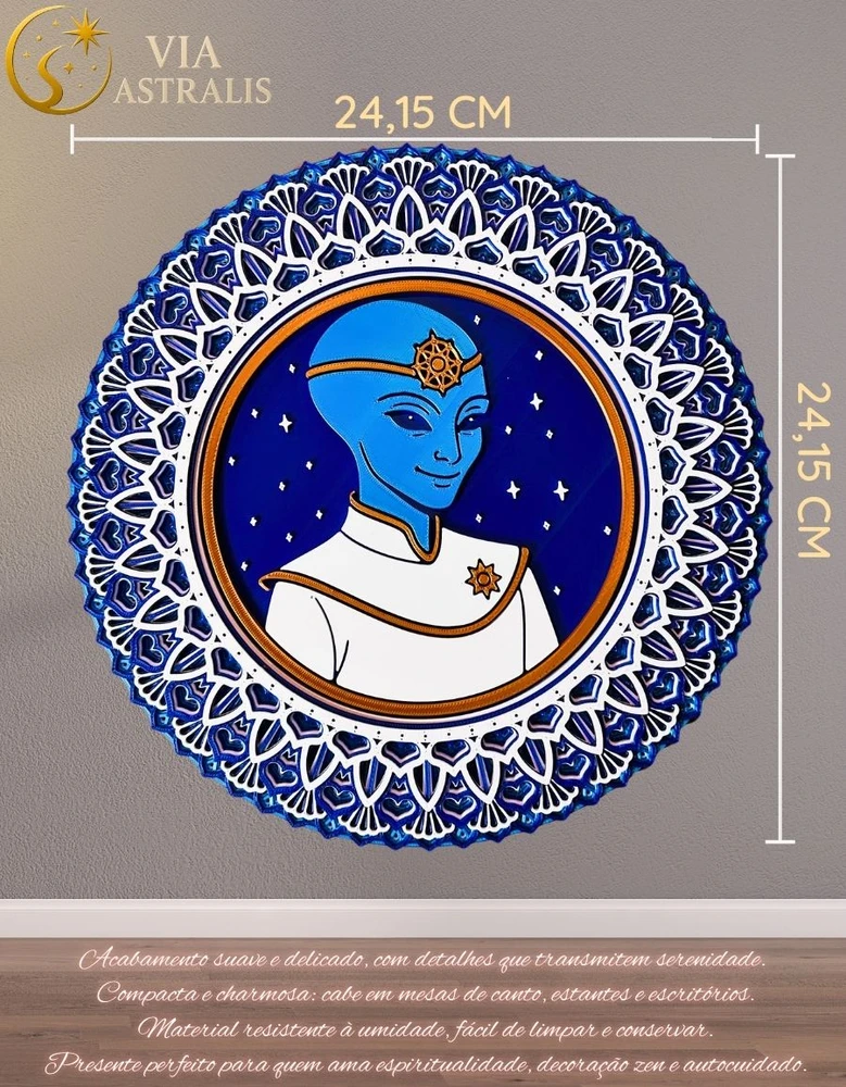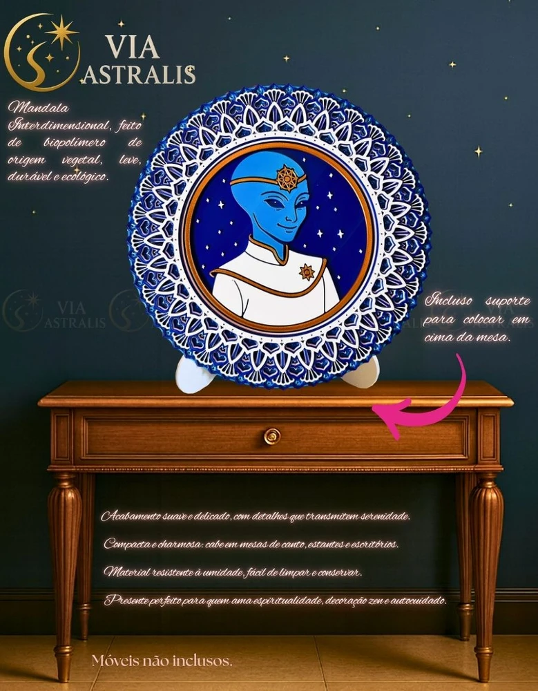 Desperte a energia cósmica com a Mandala Interdimensional de Mesa - Arcturiano Guardião da Luz da Via Astralis. Ideal para quem busca conexão espiritual profunda, essa mandala exclusiva traz a figura do guardião arcturiano, símbolo de proteção e iluminação interdimensional. Seu design detalhado em tons de azul e dourado evoca serenidade e poder energético, perfeito para meditação, espaços de cura e decoração consciente.