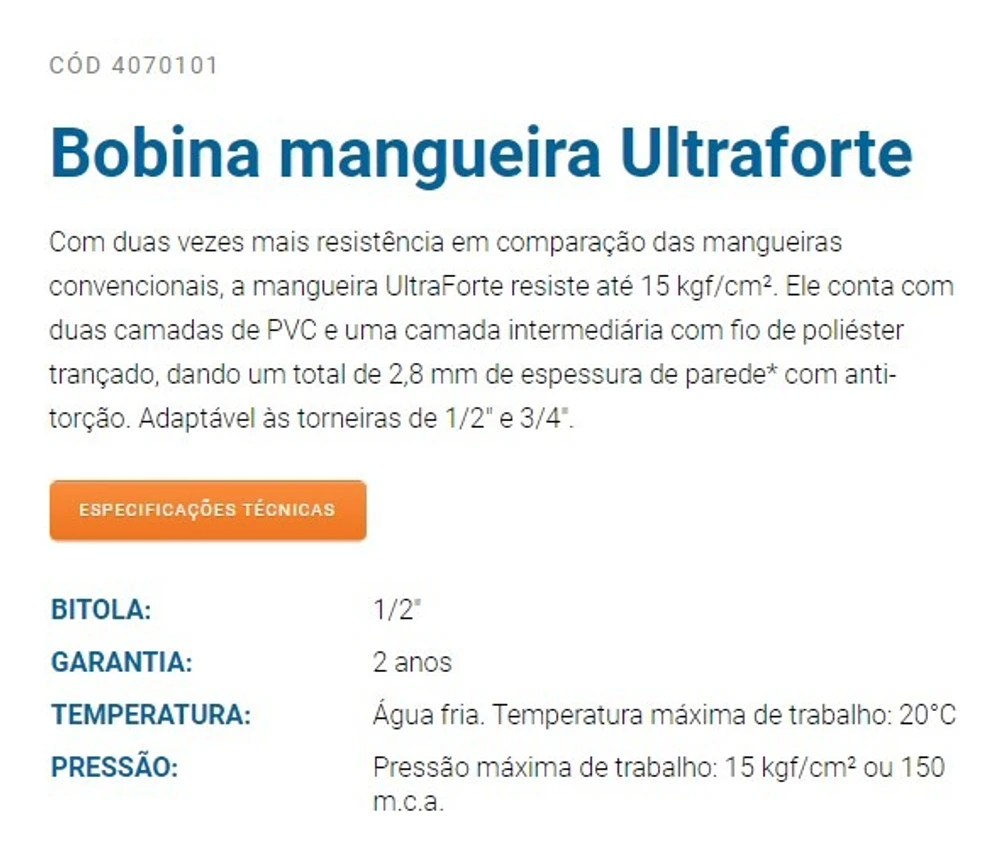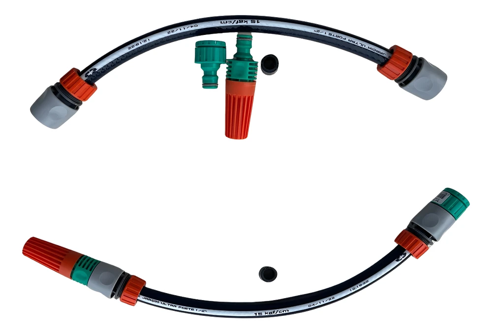A Montagem desse Kit é feita por nós.Compramos rolos com 300 metros, e montamos de acordo com a necessidade do cliente.Temos os kits com 05, 10, 15, 20, 25, 30 metros.Mangueira que utilizamos nessa montagem é a Vicqua Ultra Forte, resiste até 15 kg por centimetro quadrado. Ela tem duas camadas de PVC e uma trama de poliester como camada intermediaria, para dar maior resistencia. A parede da mangueira tem 2,8 mm de espesssura, com anti torção.Acessorios para a montagem, utilizamos da Tramontina, linha irrigação. 02 und Engate rapido de 1/2 polegada01 und Adaptador de torneira 3/4 com redução para 1/201 und Esguicho.Vendemos essa mangueira para nossos clientes institucionais, como Condominios, academias, clinicas, que tem um uso continuo, e precisam de um produto de qualidade.