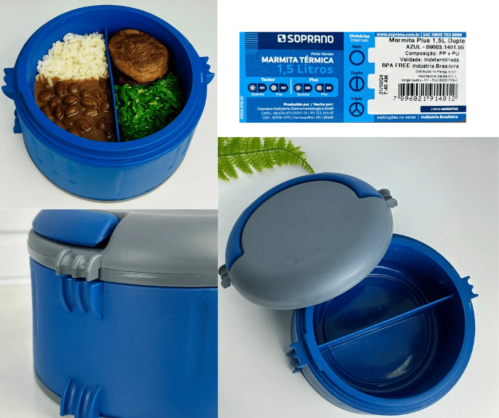 A mais tradicional e popular marmita do mercado, atendendo suas necessidades na medida certa. Muito utilizado em ambientes corporativos, construção civil, agricultura ou até mesmo no dia-a-dia para buscar comida em restaurantes. Conserva os alimentos em temperatura ideal para consumo. Acabamento robusto de alta qualidade, sistema de fechamento por rosca de encaixe, possui alça retrátil para transporte.