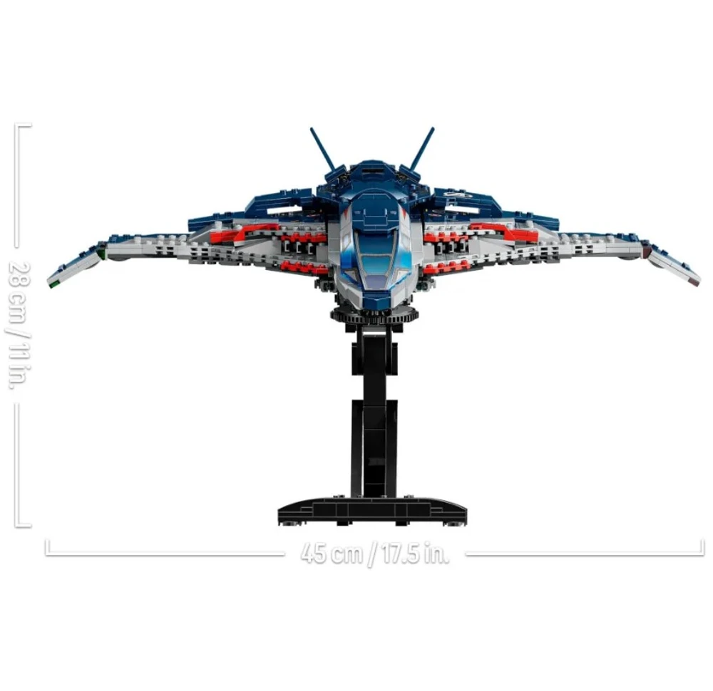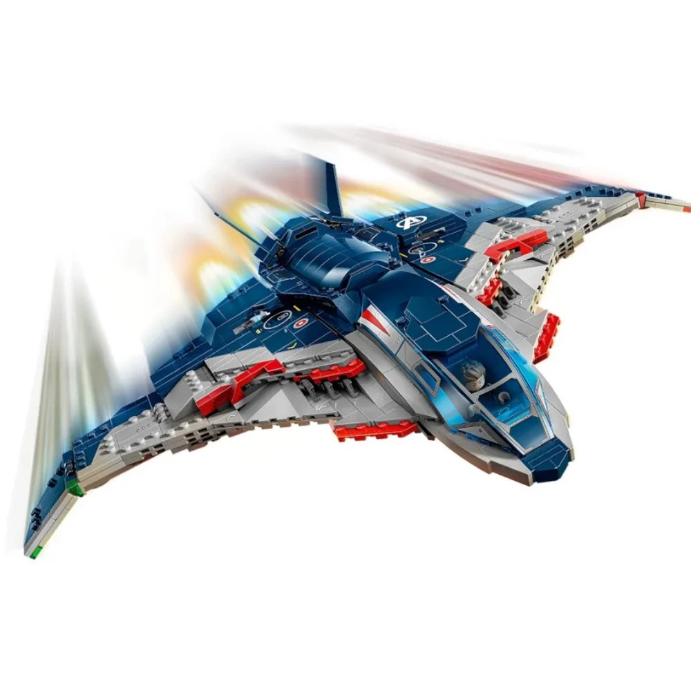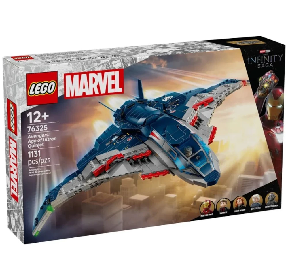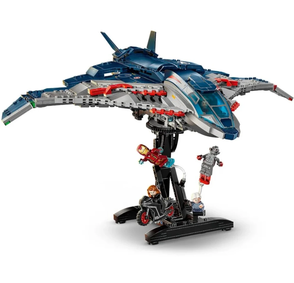 • O modelo Quinjet montável vem com 5 minifiguras: Viúva Negra com sua motocicleta; Homem de Ferro; Mercúrio; Ultron Supremo; e Gavião Arqueiro com seu arco e flecha. As minifiguras podem ser fixadas em vários locais da aeronave. O Quinjet possui um cockpit que abre, 2 lançadores de pinos na frente e armazenamento para os equipamentos da Viúva Negra e o arco do Gavião Arqueiro.
