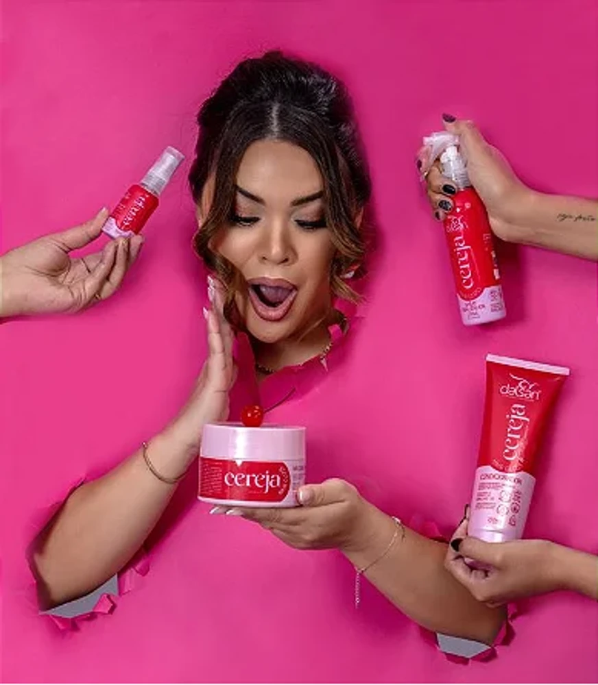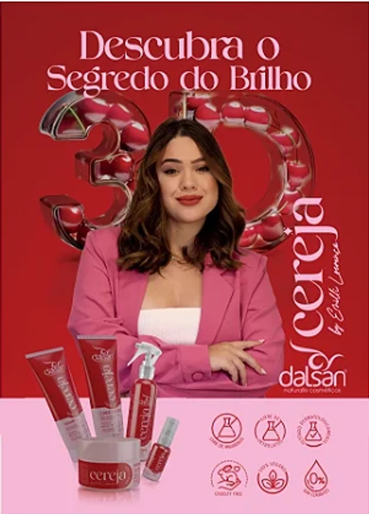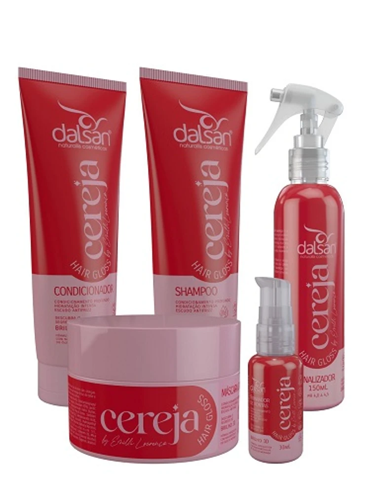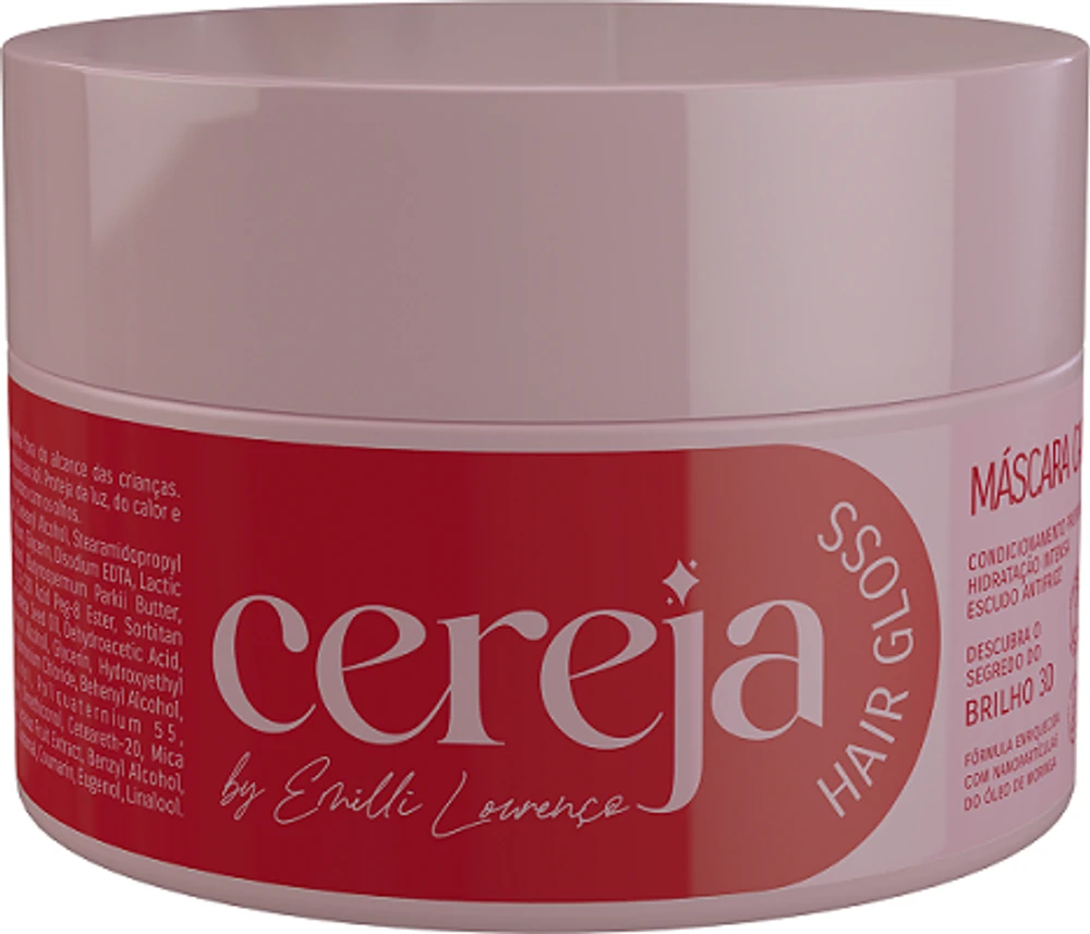 A Linha Cereja Hair Gloss by Emilli Lourenço é a junção de ativos tecnológicos que proporcionam brilho trimensional, condicionamento, hidratação e ação antifrizz. Possui óleo de moringa, rico em vitaminas A, C e E, ômegas 3, 6 e 9, nutrientes e antioxidantes. O extrato de cereja ajuda a manter a hidratação e brilho capilar.