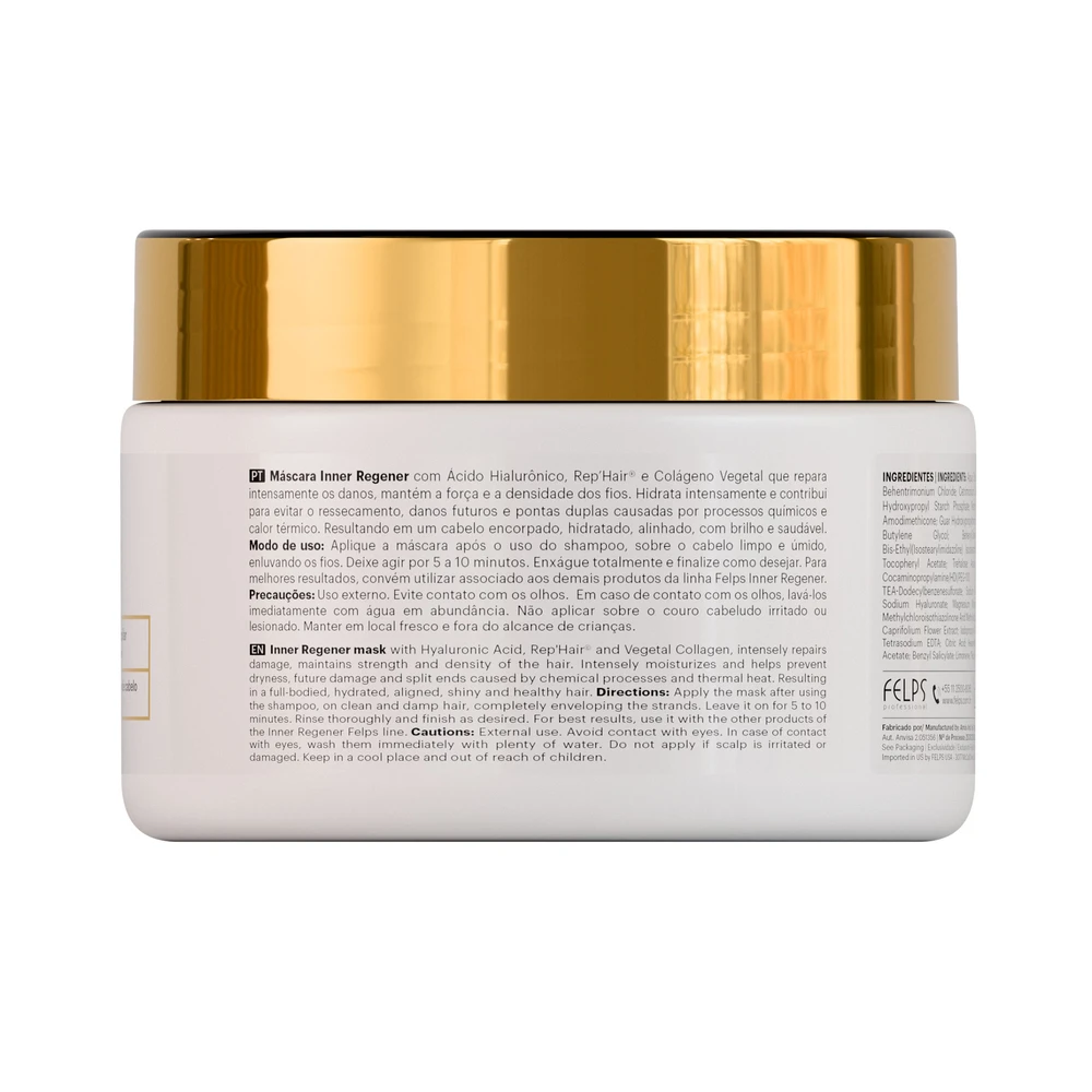 Aplique a máscara após o uso do shampoo, sobre o cabelo limpo e úmido, enluvando os fios. Deixe agir por 5 a 10 minutos. Enxágue totalmente e finalize como desejar. Para melhores resultados, convém utilizar associado aos demais produtos da linha Felps Inner Regener.