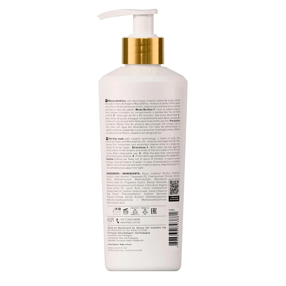 Máscara antifrizz com tecnologia Lisselini, blend de ácidos, extrato de Quiabo e óleos de Argan e Macadâmia, que promovem alinhamento capilar completo e duradouro, em uma fase única. Resultados: Alinhamento capilar, redução de volume e frizz; hidratação e brilho intenso. Indicação: Indicado para todos os tipos de cabelo.