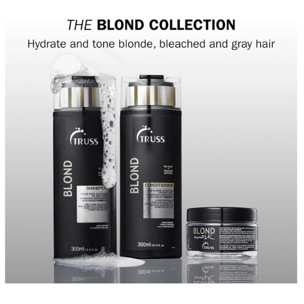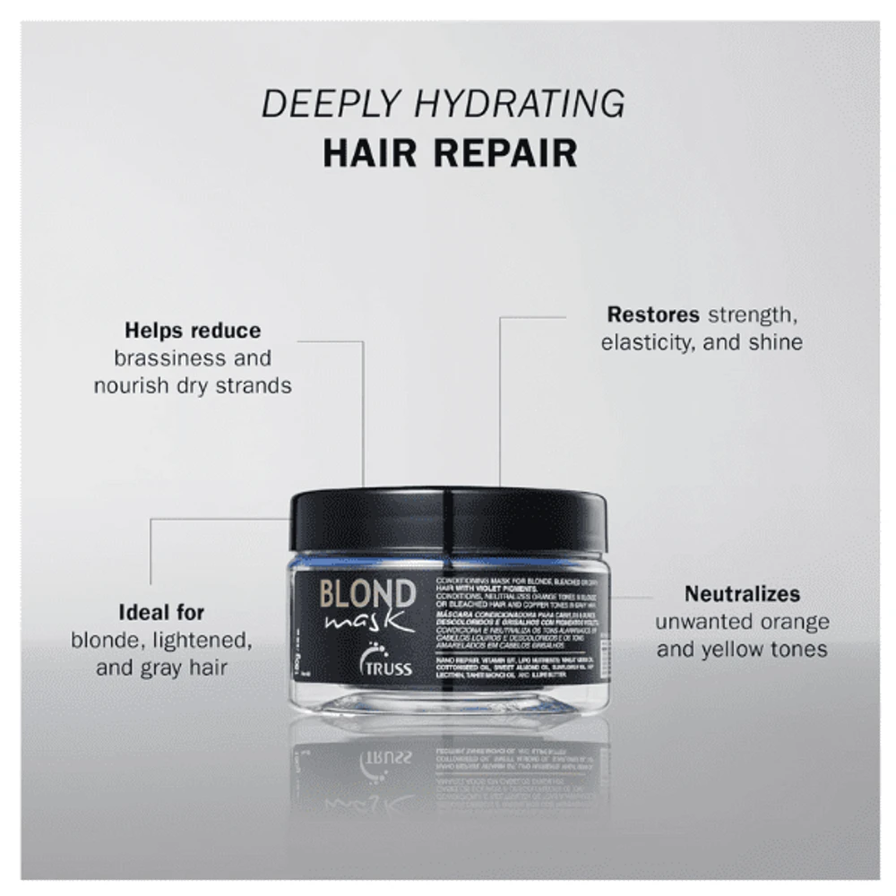 A Máscara Truss Blond é um tratamento intensivo desenvolvido especialmente para cabelos loiros, descoloridos ou grisalhos. Sua fórmula matizadora ajuda a neutralizar os tons amarelados indesejados, realçando o loiro com luminosidade e brilho platinado. Enriquecida com ativos hidratantes e reconstrutores, recupera a fibra capilar danificada por processos químicos, devolvendo força, maciez e vitalidade aos fios.