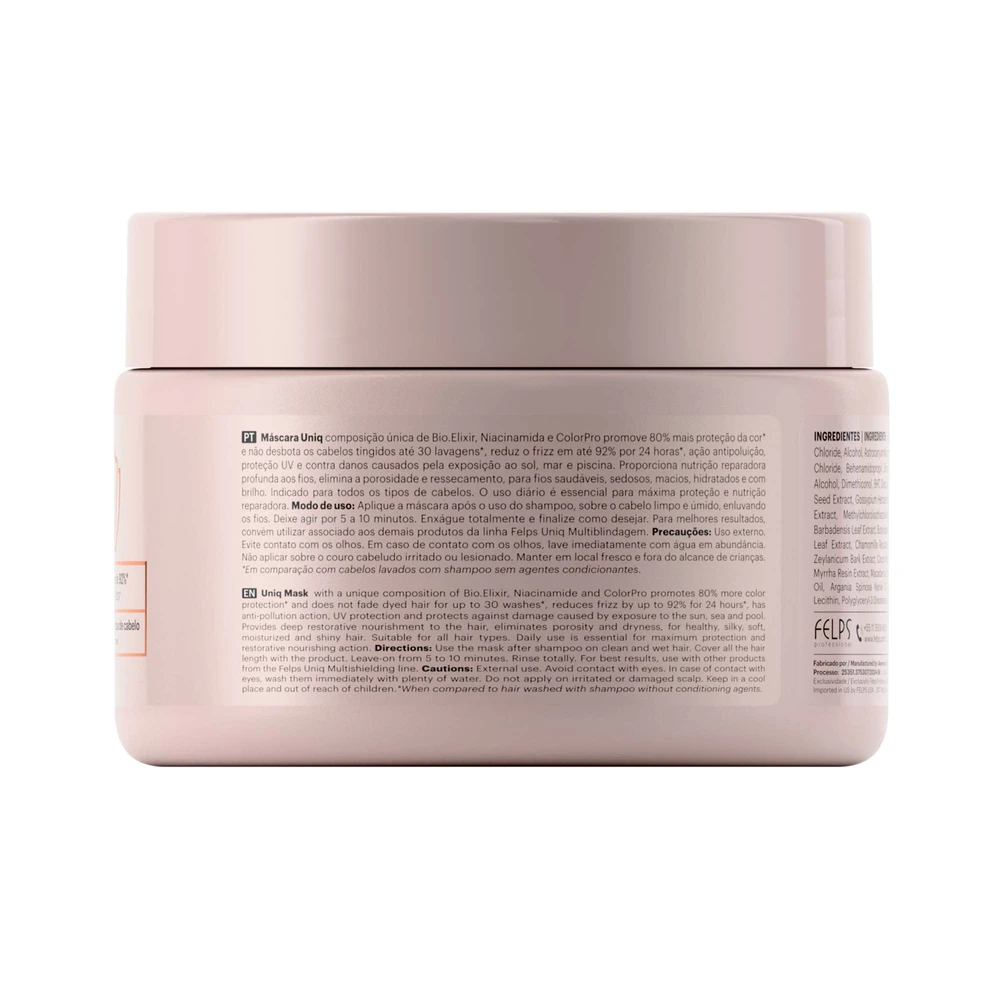 Máscara Uniq composição única de Bio.Elixir, Niacinamida e ColorPro promove 80% mais proteção da cor* e não desbota os cabelos tingidos até 30 lavagens*, reduz o frizz em até 92% por 24 horas**, ação antipoluição, proteção UV e contra danos causados pela exposição ao sol, mar e piscina. Proporciona nutrição reparadora profunda aos fios, elimina a porosidade e ressecamento, para fios saudáveis, sedosos, macios, hidratados e com brilho. Indicado para todos os tipos de cabelos. O uso diário é essencial para máxima proteção e nutrição reparadora.