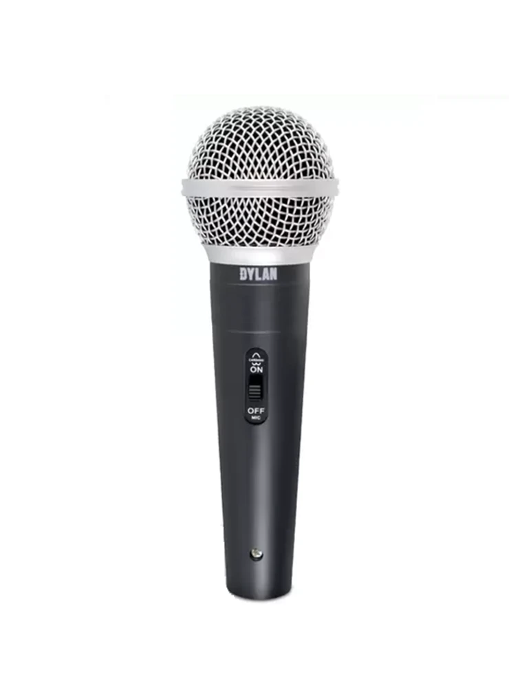 Construção padrão de microfone dinâmico, com corpo metálico robusto. Acabamento funcional e prático, comum em microfones de uso cotidiano.