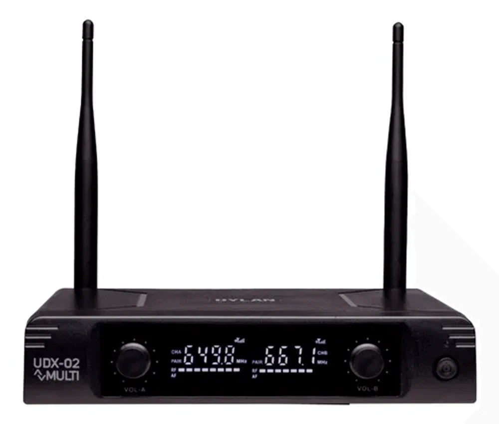 Sistema sem fio UHF com 1 receptor (dual-antena) e 2 microfones bastão (transmissores), pensado para voz (canto/fala) em eventos, igrejas, palestras e pequenos shows.