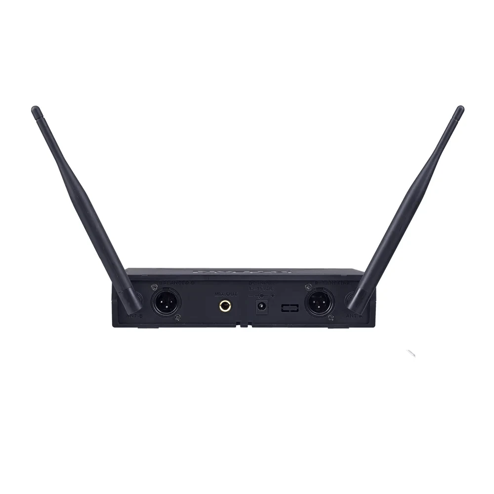 Receptor com saídas balanceadas e antenas destacáveis — adequado para integração em mesas e PA.