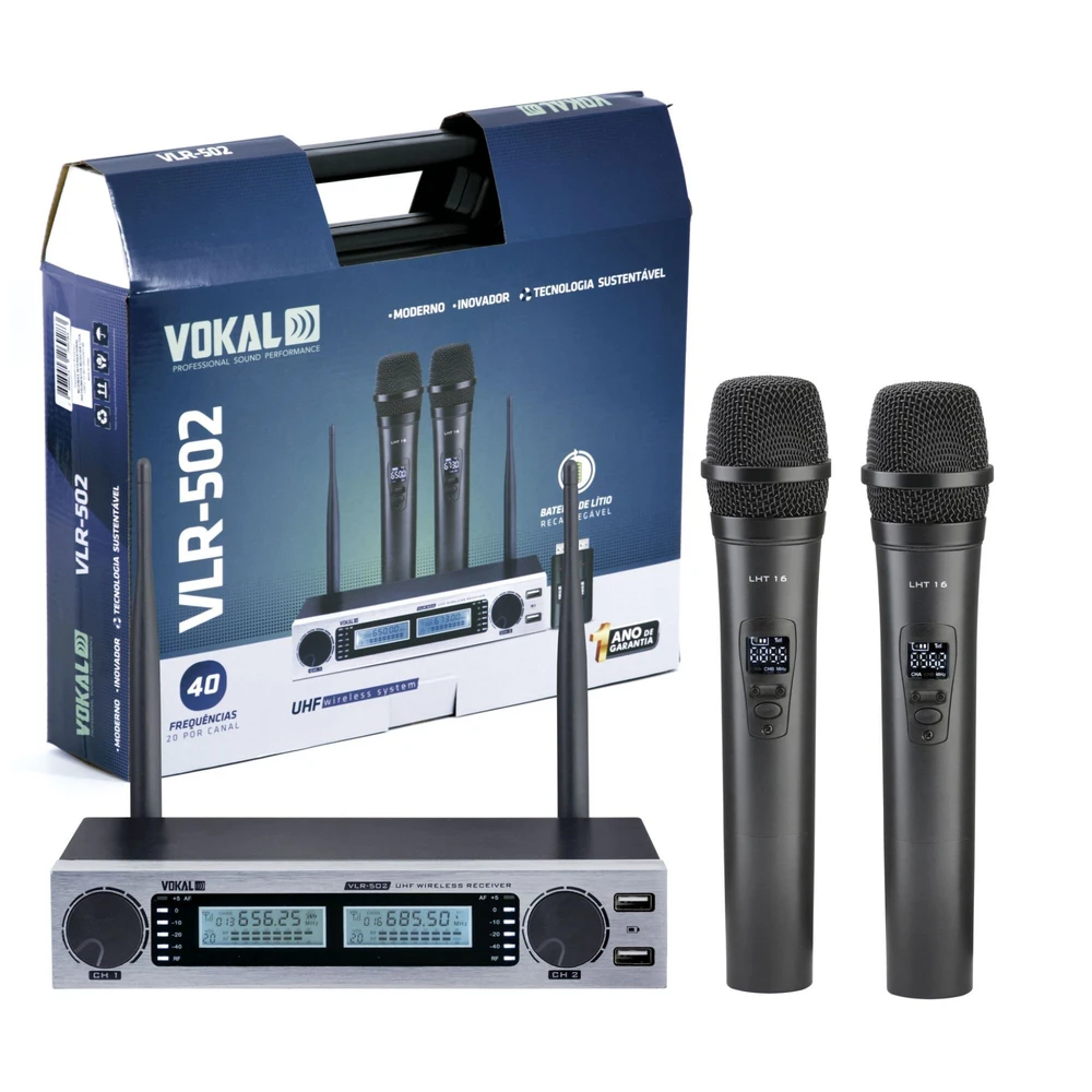 Microfone sem fio Duplo VLR502 UHF com 16 canais e baterias recarregáveis O sistema sem fio Vokal VLR-502 oferece performance profissional com dois microfones de mão UHF, visor em LED e recarga USB direta no receptor. Ideal para igrejas, eventos e palestras, possui 20 canais por microfone, cápsula dinâmica cardioide e bateria de lítio recarregável com circuito de proteção. Seu receptor em chassi metálico conta com saídas XLR individuais e mixada P10, oferecendo máxima estabilidade, qualidade sonora e praticidade. Um sistema confiável para quem precisa de autonomia e eficiência com ótimo custo-benefício. ESPECIFICAÇÕES Sistema sem fio UHF duplo de mão Receptor com antenas articuláveis e sintonia por código ID 20 frequências diferentes por canal Método de programação DQPSK Display LED com informações de áudio, canal e frequência Botão Power com três modos: ligado, desligado total e modo carregador ativo Saídas XLR independentes + saída P10 mixada Controles de volume individuais Conectores USB frontais para recarga das baterias Chassi metálico com pés de borracha e painel em alumínio Faixa de frequência UHF: 470~694 MHz Resposta de frequência: 40Hz ~ 20kHz Relação sinal/ruído: >98dB Sensibilidade: >5dBm Fonte bivolt 100-240V AC | Saída 12V DC – 2A Transmissores manuais com cápsula CTR-3 dinâmica cardioide Globo metálico com espuma interna anti-puff Chassi metálico leve e resistente Display com indicação de canal, frequência e nível de bateria Troca de frequência por botão Distância média de operação: 40 metros (sem obstáculos) Alimentação: bateria USB VLB-1 (3,7V x 800mA) ou 2x pilhas AA Recarga USB via receptor (LED de status) Potência de transmissão: >10dBm Modulação: FM Cápsula CTR-3 Padrão polar: cardioide Impedância: 600 Ohms Resposta de frequência: 60Hz ~ 15kHz Sensibilidade: -53±3dB em 1kHz DICAS DE USO Ideal para igrejas, palestras e eventos ao vivo com dois oradores ou vocalistas. Utilize a recarga USB no receptor para manter os microfones sempre prontos sem depender de pilhas. Prefira baterias VLB-1 originais para máxima segurança e durabilidade. Em ambientes grandes, mantenha o receptor em local alto e livre de obstáculos para melhor sinal.
