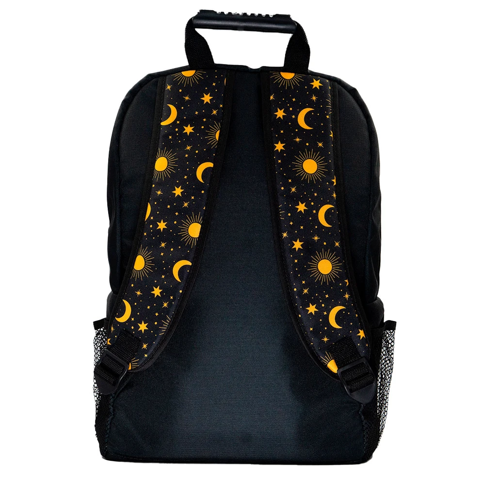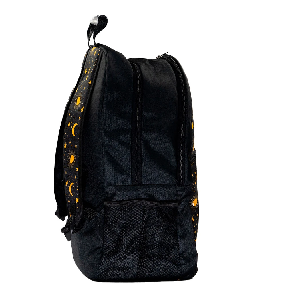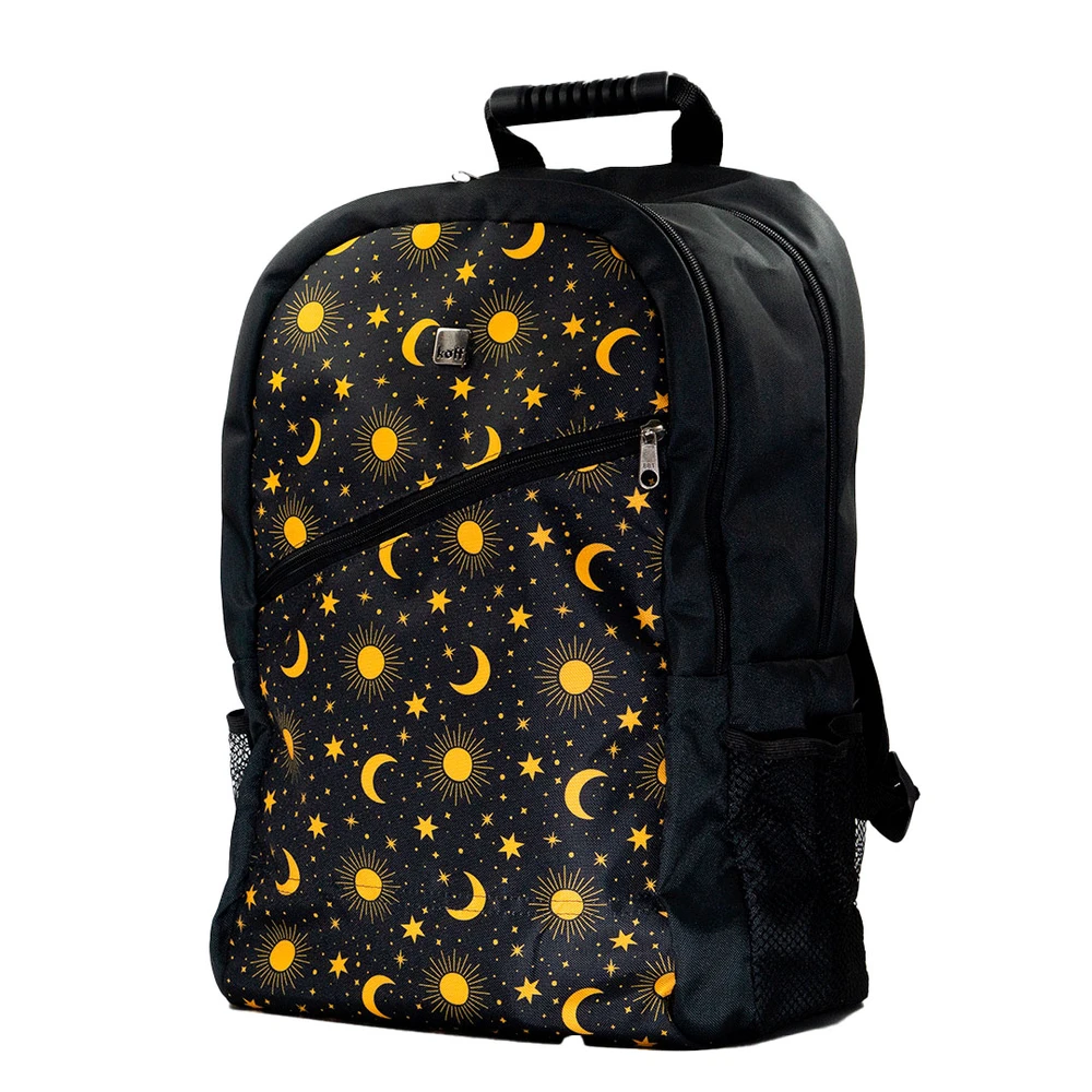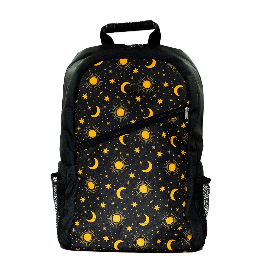 A Mochila Eclipse da Koff® traz a combinação perfeita entre estilo e funcionalidade para quem busca exclusividade no dia a dia. Com estampa única de sol, lua e estrelas em amarelo vibrante sobre fundo preto, ela transforma qualquer look com um toque de personalidade cósmica.