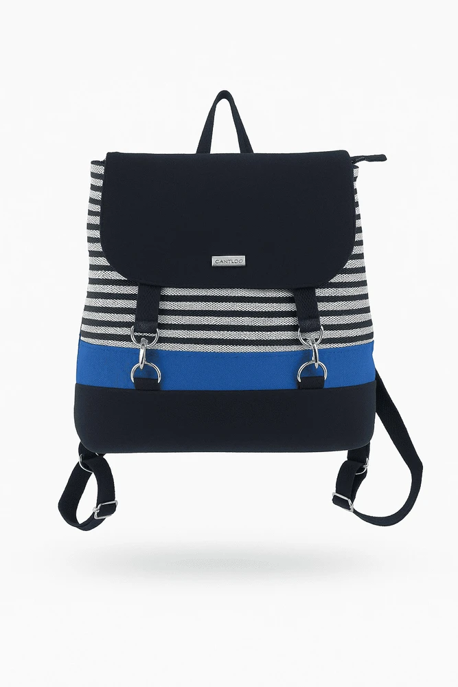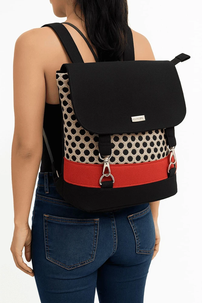 Descubra a mochila que une design único com praticidade para mulheres modernas. Com estampas listradas ou de bolinhas, combinadas com detalhes em cores vibrantes como azul ou vermelho, esta mochila é perfeita para quem busca um acessório versátil e cheio de personalidade.