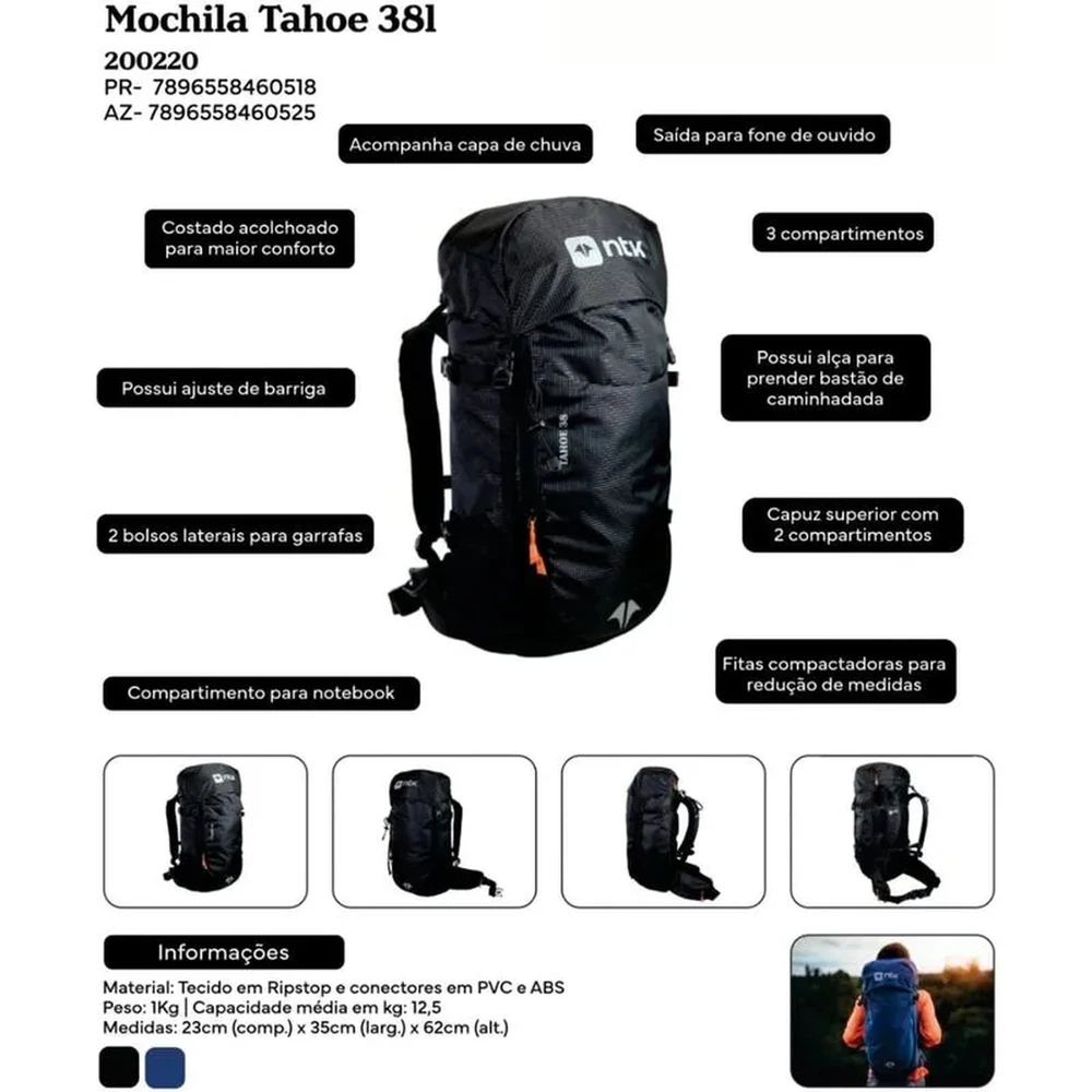 Mochila Nautika Tahoe 38 L (Modelo 200220-PR) Espaçosa e Resistente para Trilhas e Viagens Profissionais