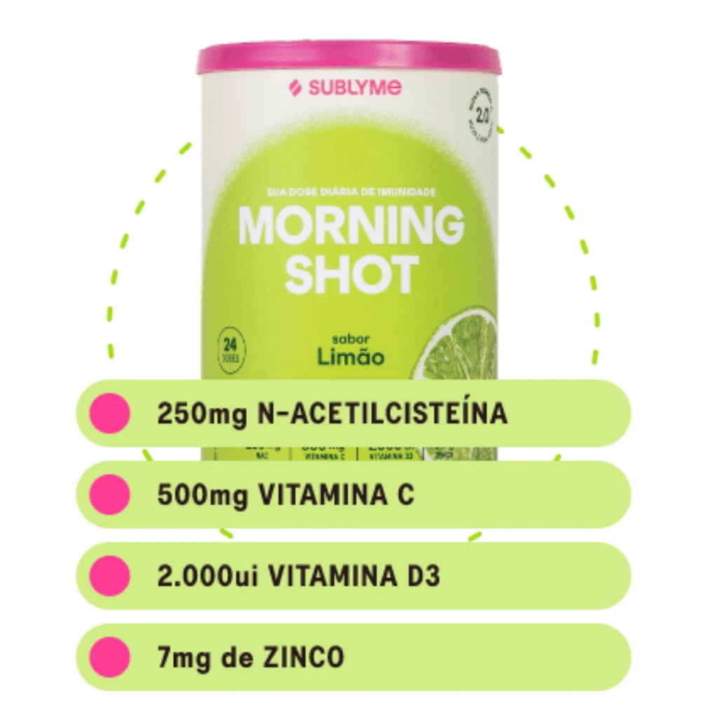 Morning shot é um concentrado de nutrientes exclusivamente combinados para proporcionar a sua dose diária de imunidade. O Morning Shot 2.0 tem um blend de nutrientes capaz de potencializar o funcionamento do sistema imune e auxiliar na proteção dos danos causados pelos radicais livres. Ele é a defesa inteligente que seu organismo precisa para ter mais proteção e saúde diariamente. Ao escolher o Morning Shot 2.0, você economiza mais de 60% em comparação a compra dos ingredientes individualmente!