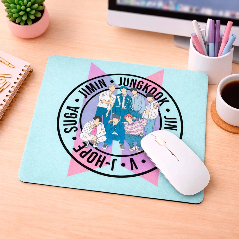 Chamando todas as ARMYs! 💜 A hora de estudar, trabalhar ou se divertir no computador acaba de ganhar um upgrade com o Mousepad BTS! Com um design exclusivo e vibrante, reunimos o grupo de K-pop mais amado do mundo em uma arte moderna que vai deixar sua mesa cheia de personalidade. Produzido com superfície macia e base antiderrapante, ele garante conforto, estabilidade e estilo em cada movimento do mouse. A escolha perfeita para presentear ARMYs de todas as idades!  Especificações: Largura: 16cm Comprimento: 19cm Material: Base: Borracha Topo: Neoprene