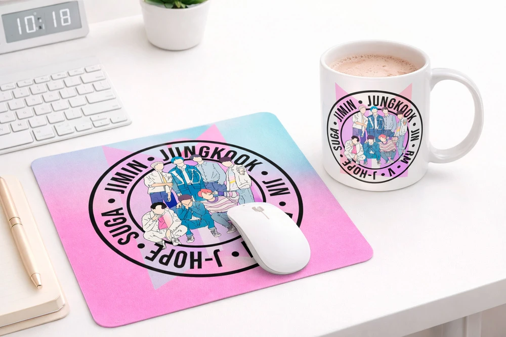 Chamando todas as ARMYs! 💜 A hora de estudar, trabalhar ou se divertir no computador acaba de ganhar um upgrade com o Mousepad BTS! Com um design exclusivo e vibrante, reunimos o grupo de K-pop mais amado do mundo em uma arte moderna que vai deixar sua mesa cheia de personalidade. Produzido com superfície macia e base antiderrapante, ele garante conforto, estabilidade e estilo em cada movimento do mouse. A escolha perfeita para presentear ARMYs de todas as idades! Especificações: Largura: 16cm Comprimento: 19cm Material: Base: Borracha Topo: Neoprene
