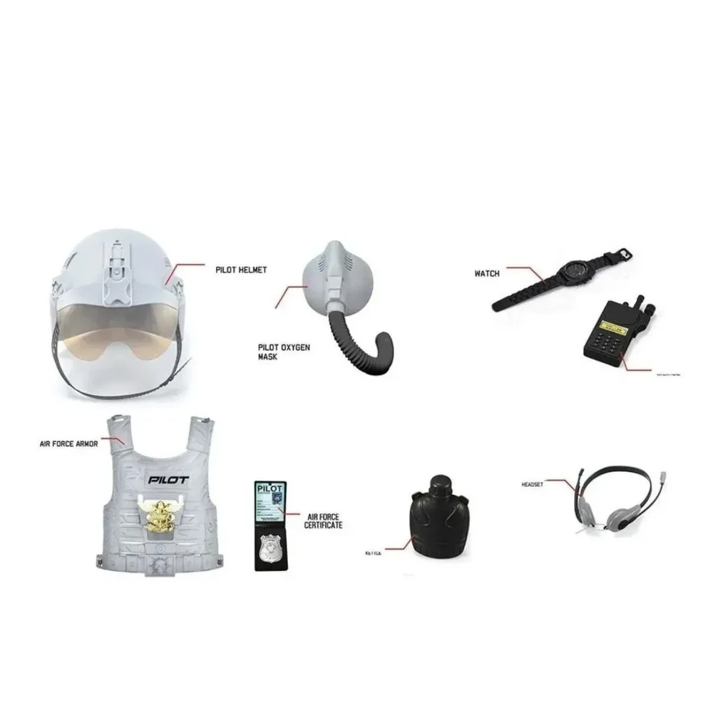 Itens inclusos: capacete, máscara de oxigênio, colete, distintivo, cantil, relógio, walkie talkie e fone