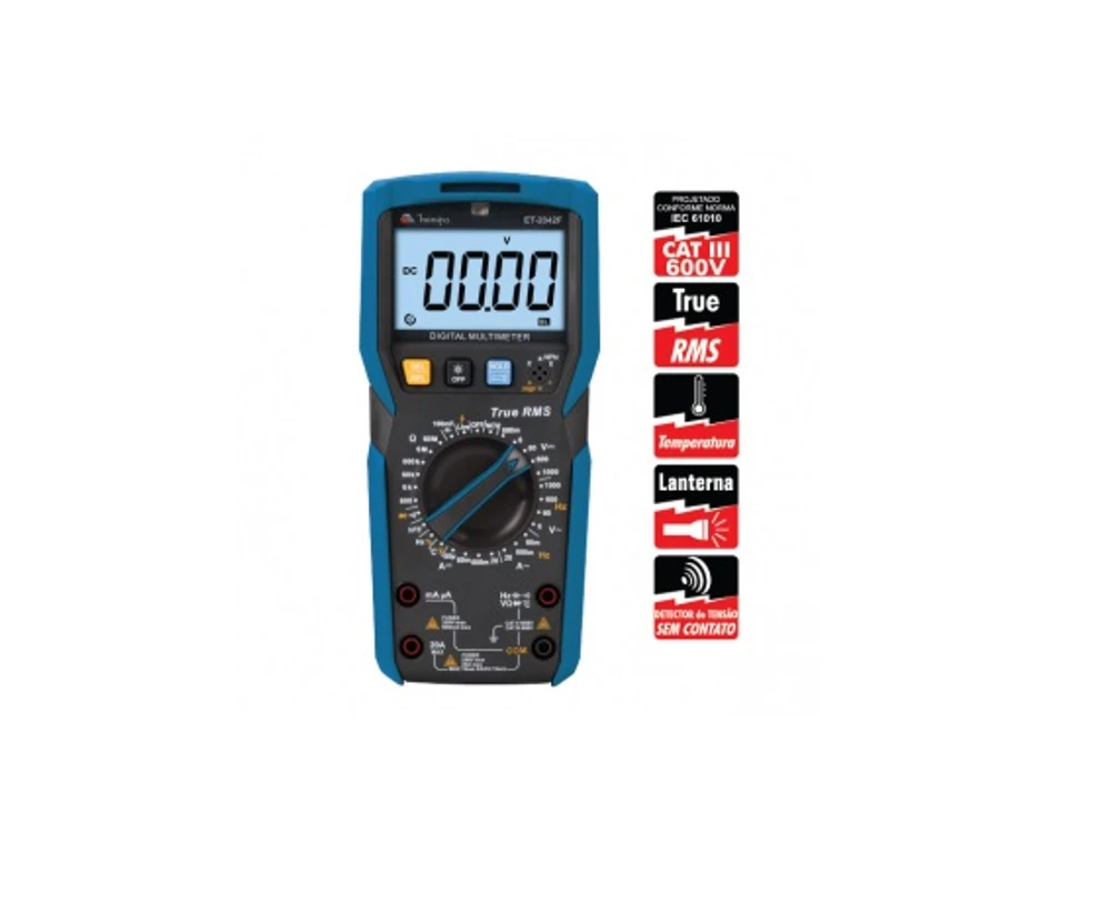 Diferencia-se por ser um multímetro digital com display de 6000 contagens com iluminação de fundo (backlight) Faz medidas de tensão DC / (AC RMS), corrente DC / (AC RMS), resistência, capacitância, frequência de rede, testes de diodo, temperatura, continuidade e hFE de transistor Como características adicionais apresenta as funções True RMS, Auto Power Off, indicador de bateria fraca, função NCV e identificação de Linha Viva. CARACTERÍSTICAS Display LCD de 3 5/6 Dígitos, 6000 contagens; Indicação de Bateria Fraca: O display exibe o símbolo “ ”; Indicação de Sobrefaixa: O display indicará o símbolo “OL”; Taxa de atualização: Aprox. 2~3 vezes por segundo; Mudança de Faixa: Manual/Automática; Indicador de Polaridade: Automático; Teste de Transistor (hFE); Função Data Hold; Função Auto Power OFF; Sensor Crepuscular; Lanterna; Indicador Visual de Estado por LED indicativo; Medidas de Temperatura; Identificação de Linha viva; Detector de Tensão sem Contato; True-RMS AC; Função Relativo; Ambiente: Operação: 0°C ~ 40°C; Armazenamento: -20°C ~ 60°C; Umidade Relativa: 0°C ~ 30°C =75%, 30°C ~ 40°C =50% Altitude: Operação e Armazenamento: até 2000 metros; Segurança/Conformidade: de acordo com a IEC61010-1, Categoria de sobretensão CAT III 600V e dupla isolação; Proteção: Fusível no terminal mA/µA - 630mA/250V; Fusível no terminal de 20A - 20A/250V; Grau de poluição: 2; Alimentação: 4 pilhas de1,5V tipo AAA; Peso: Aprox. 345 gramas (Incluindo bateria);