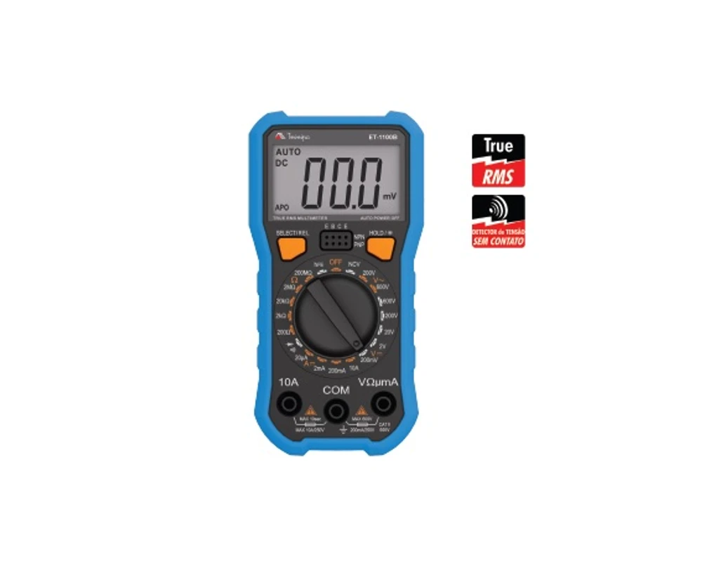 O ET-1100B possui também Função NCV (Indica se um condutor está energizado, sem precisar expor ou fazer contato com o condutor), realiza medidas precisas de Tensão AC, por ser um aparelho True Rms, pode ser usado também para medir Corrente DC até 10A, mas fique atento, é necessário tomar alguns cuidados (explicado no manual do equipamento) para não danificar o aparelho. Esse Multímetro se enquadra na Categoria II da NR-10 (Aparelhos domésticos, Tomadas e afins). Outra praticidade que o ET-110B lhe oferece, é função para Medir Hfe de transistor, possuindo uma pequena "Protoboard", para você espetar o transistor a ser testado.