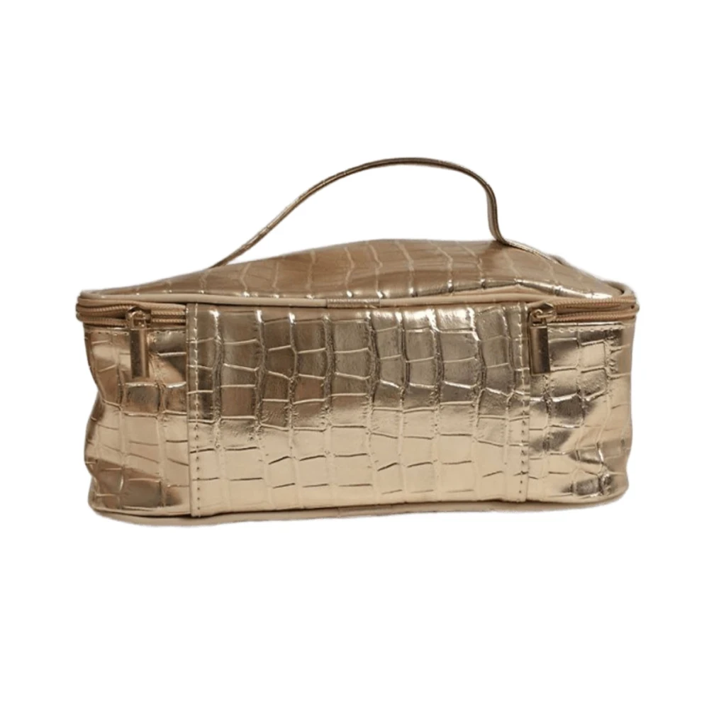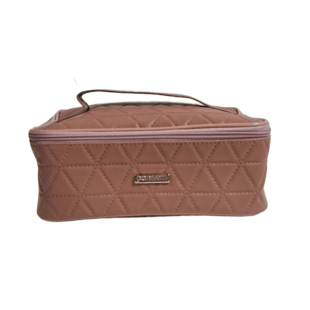 Compacta e resistente, é confeccionada em material sintético de fácil limpeza e conta com fechamento em zíper, além de alça para transporte. Seu interior espaçoso permite acomodar maquiagens, produtos de higiene e pequenos acessórios com total segurança e estilo.
