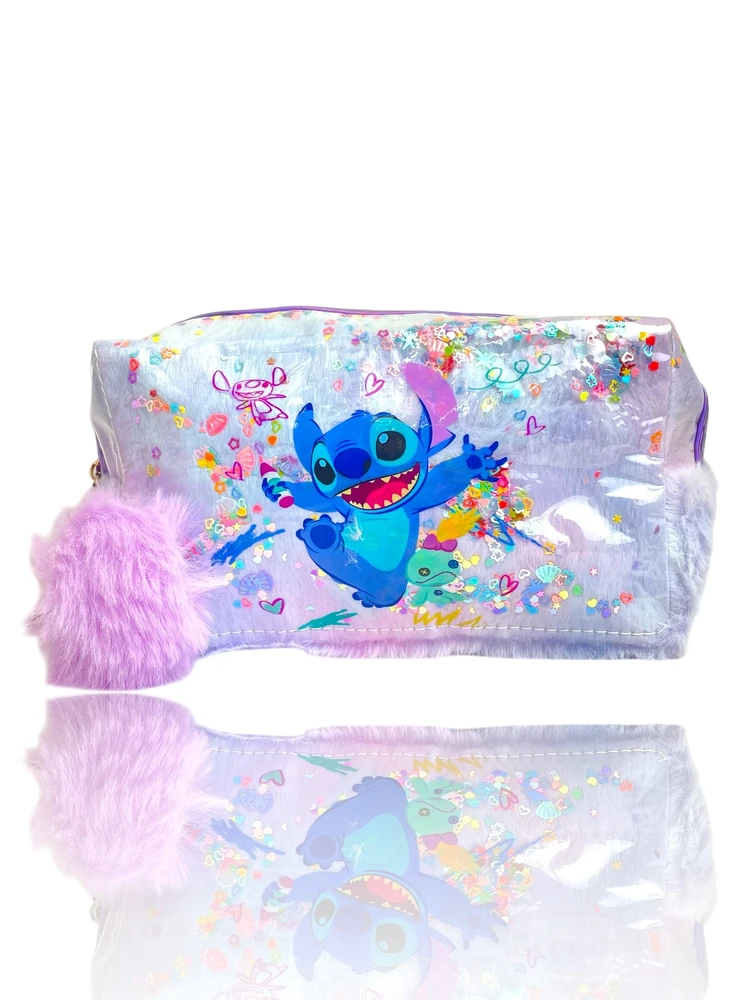 A Necessaire Stitch com Pelúcia e Glitter combina fofura, brilho e muito estilo. Feita em material macio com acabamento em pelúcia lilás, ela possui frente transparente com o personagem Stitch e glitter colorido solto, criando um efeito encantador a cada movimento.