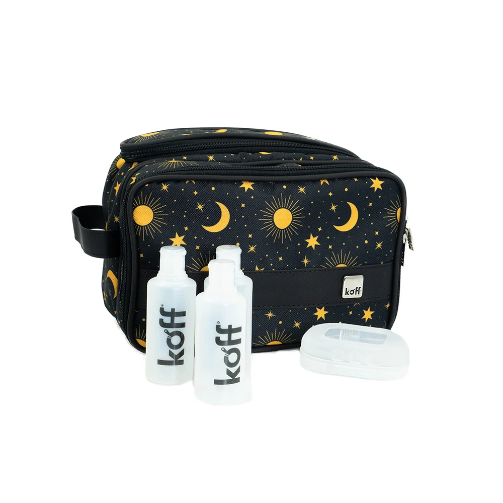 Com dimensões ideais para o transporte de itens de higiene e autocuidado, a Necessaire Viagem Eclipse é a escolha perfeita para viagens curtas e voos, atendendo às normas de transporte de líquidos com seus frascos reutilizáveis.