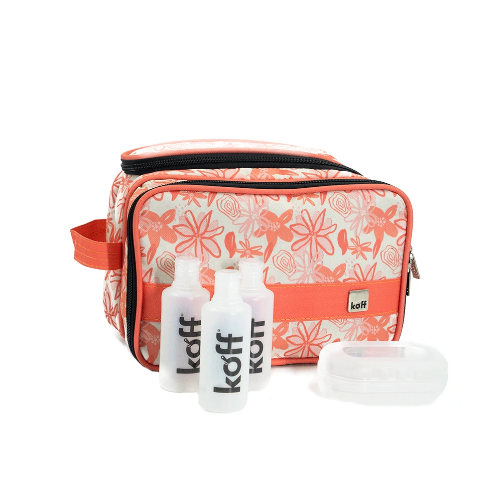 Feita em poliéster estampado, conta com plaquinha metálica Koff® e puxador personalizado em níquel. Acompanha 3 frascos reutilizáveis e uma saboneteira, atendendo aos padrões de voos e deslocamentos rápidos.