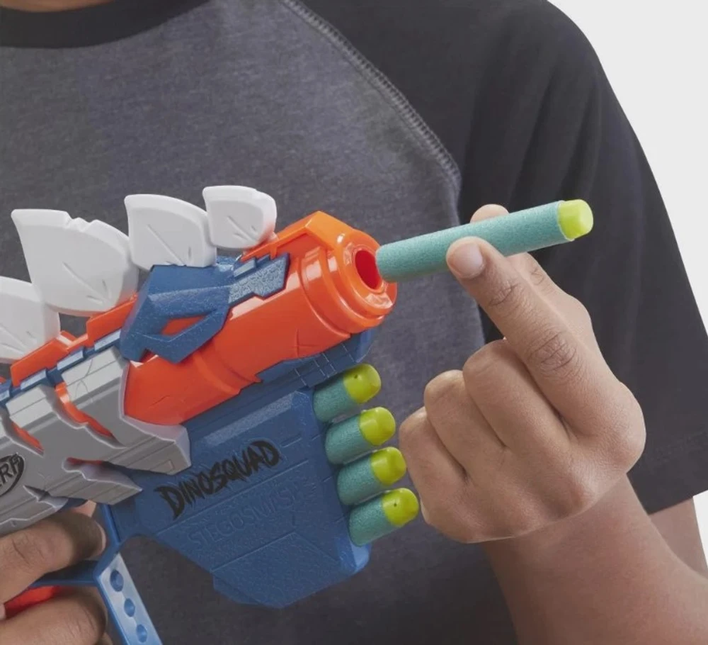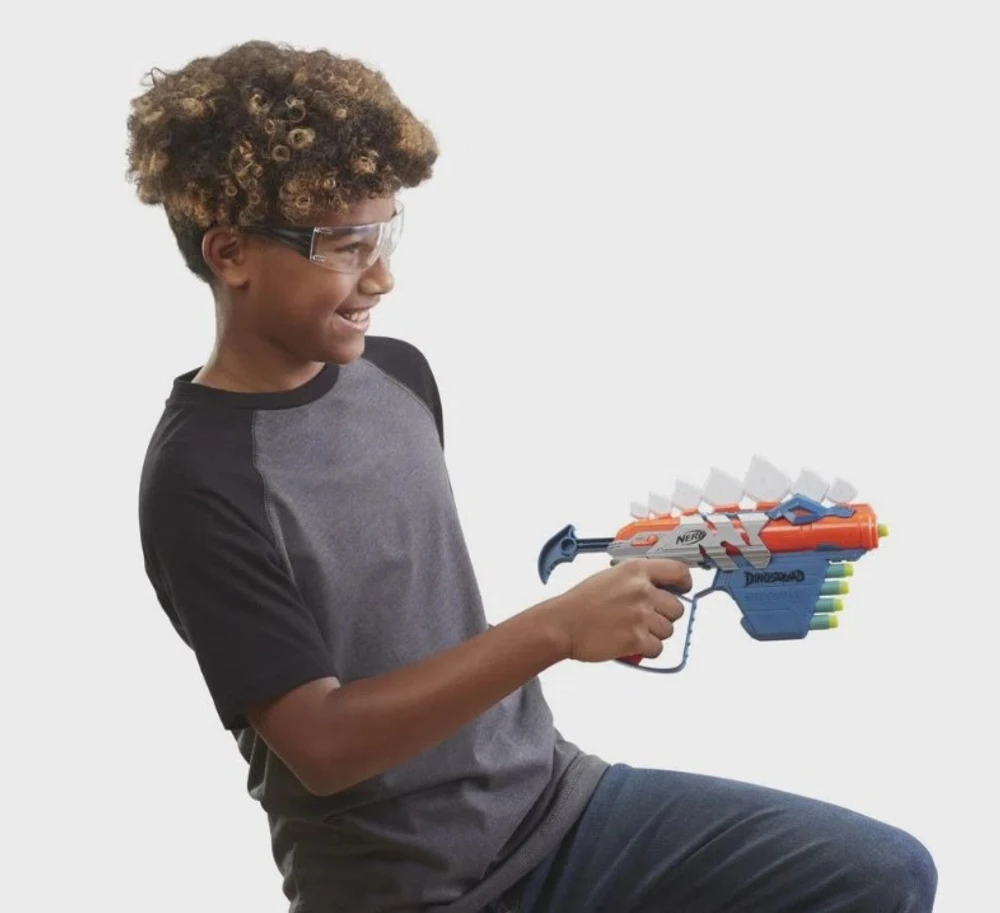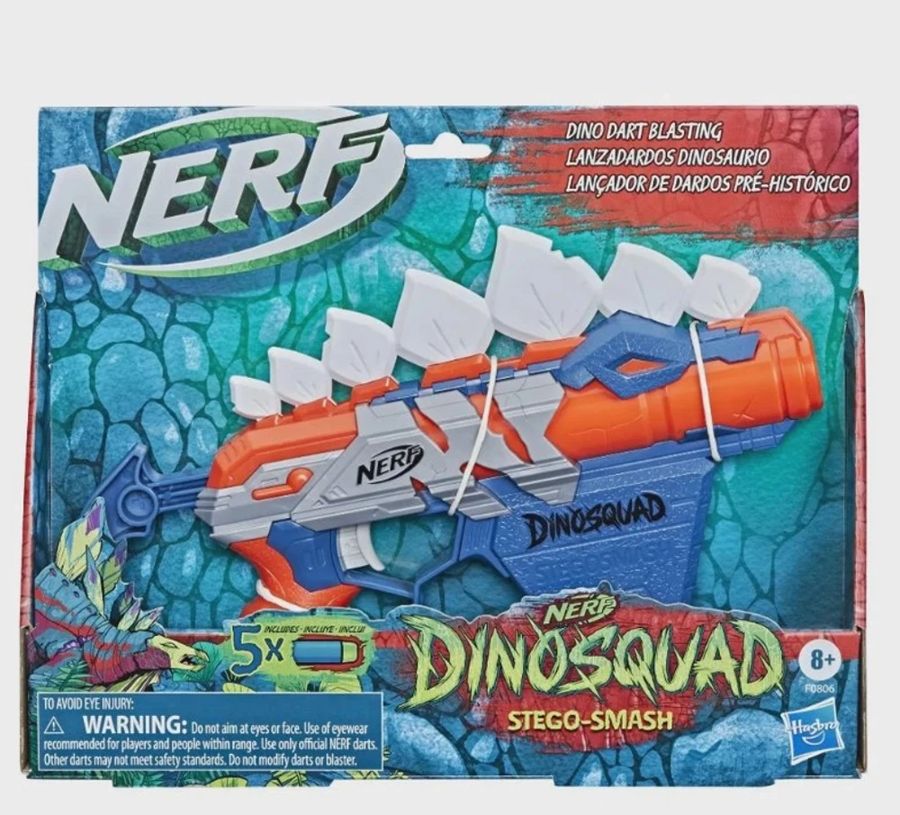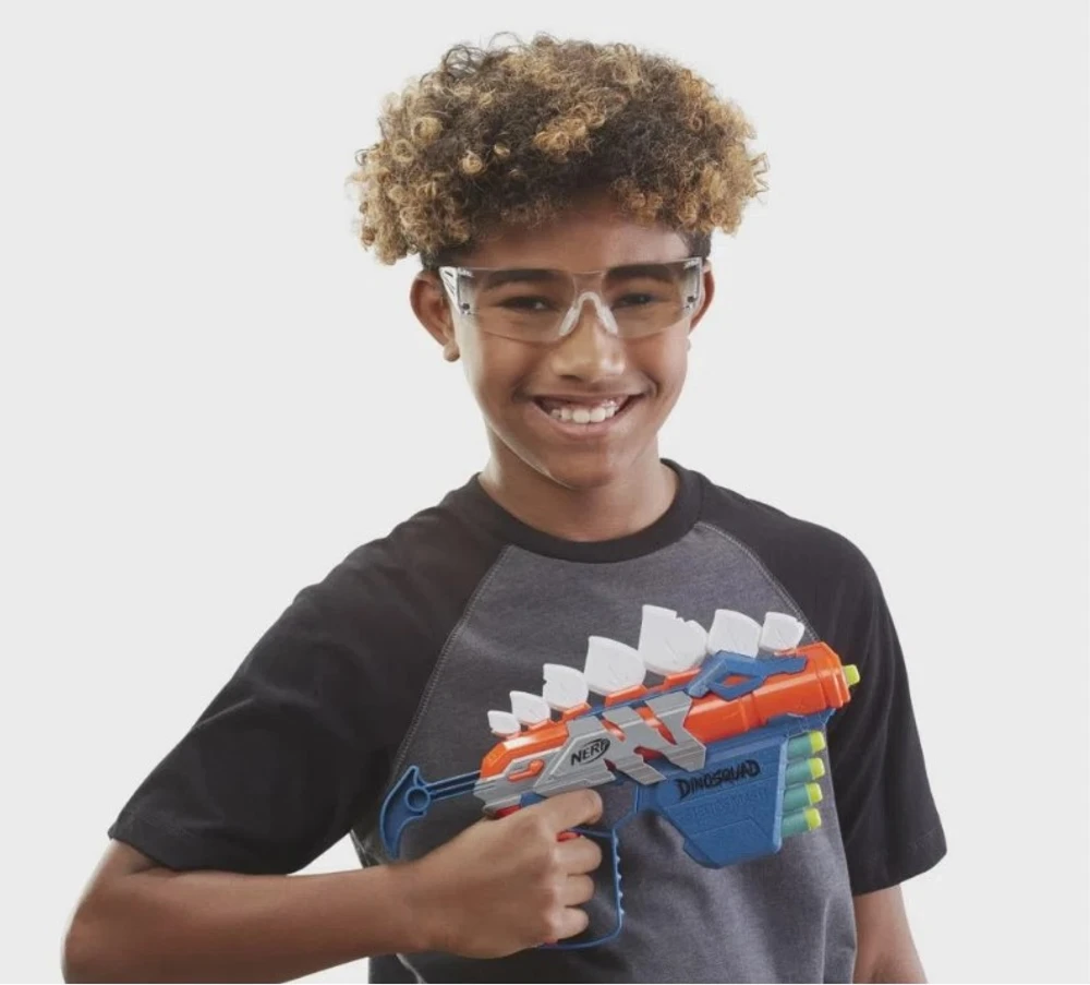 A aventura ganha novas emoções com estes lançadores do time de elite DinoSquad! Os mais poderosos dinossauros inspiram o design destes lançadores, trazendo grande ação à aventura!; Ação jurássica com este lançador de dardos Nerf DinoSquad Stego-smash! Possui um design impressionante de dinossauro, com a aparência de um estegossauro. O lançador possui carga frontal - basta inserir 1 dardo no tubo frontal, preparar e lançar. O lançador possui porta-dardos para 4 dardos no apoio, para manter dardos ao alcance para recarregar e continuar brincando. Inclui 5 dardos oficiais de espuma Nerf Elite que são testados e aprovados para desempenho e qualidade. Óculos recomendados (não incluídos). Não requer pilhas.; Nerf e todas as propriedades relacionadas são marcas registradas da Hasbro.